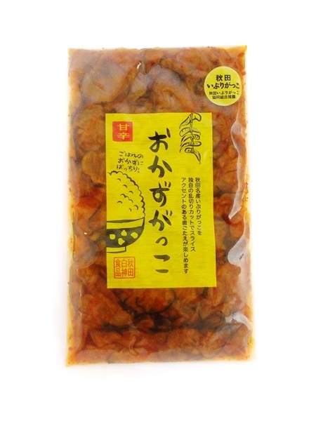 秋田名物のいぶりがっこを食べやすい大きさに乱切りカットし、細切り昆布を加え、鰹節風のタレで味付けしたおかずがっこ。