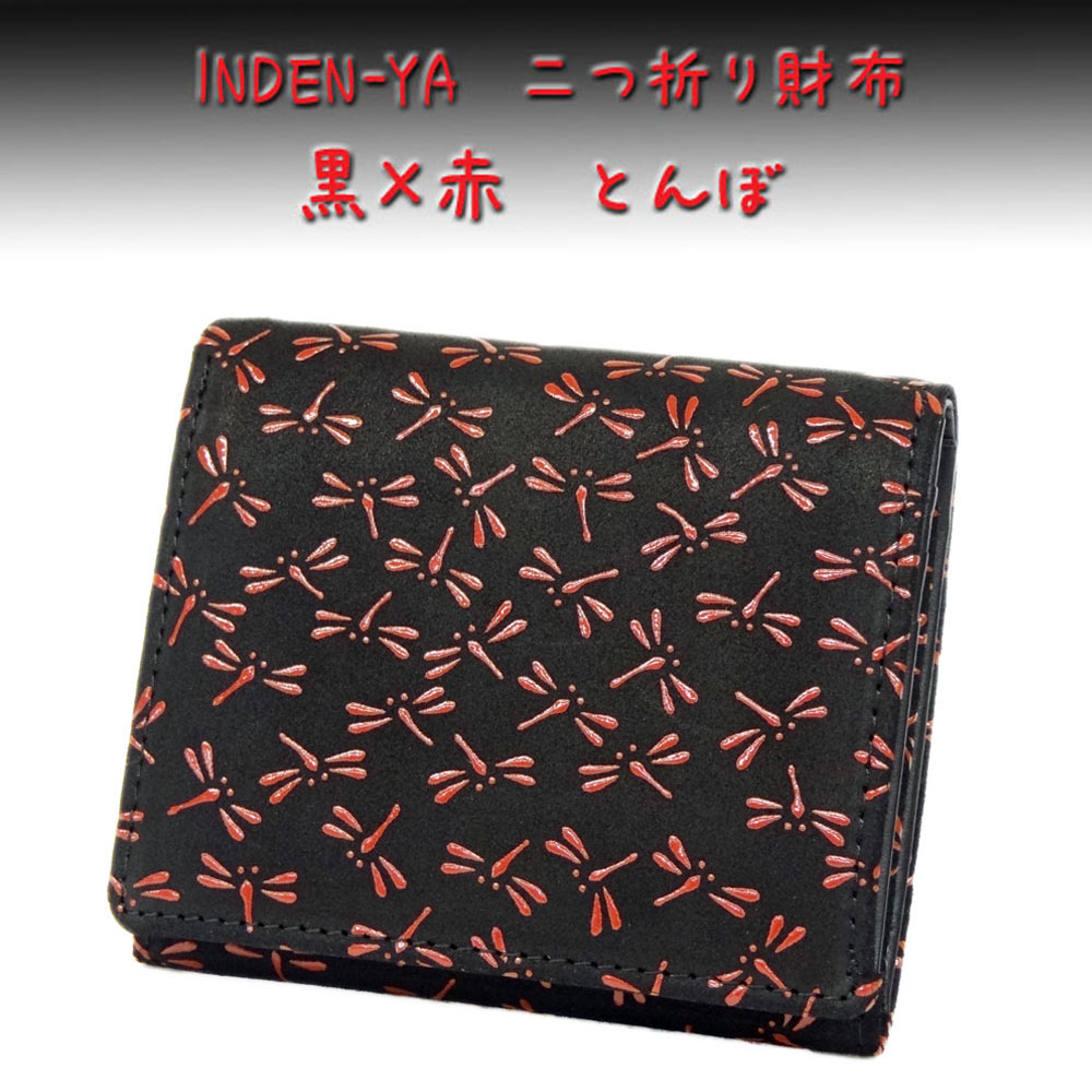印傳屋 印伝 財布 二つ折り札入 2204 黒地鹿革赤漆 とんぼ 爆買
