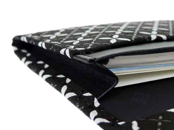 「そよか」は黒地の鹿革に白の更紗で柄付けし、乾燥後に黒漆で再度柄付けしています。