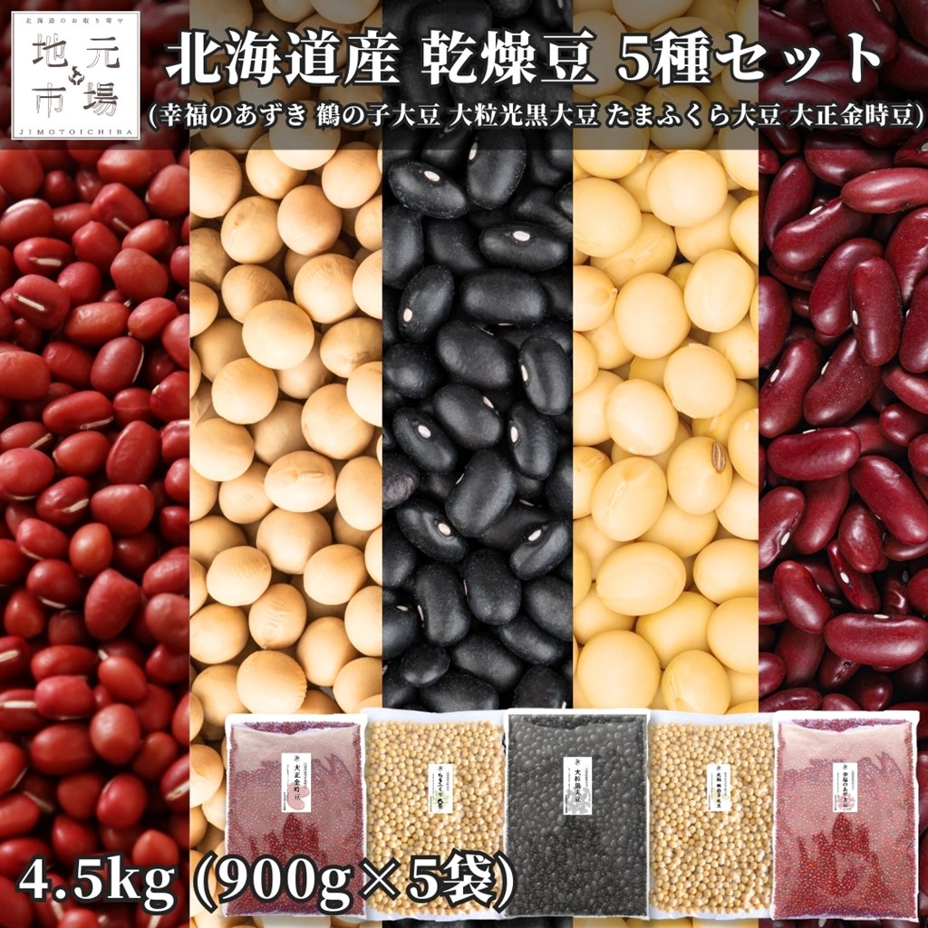北海道産 幸福あずき豆 鶴の子大豆 大粒光黒大豆 たまふくら大豆 大正金時豆 5種セット (各900g) チャック付き 乾燥豆