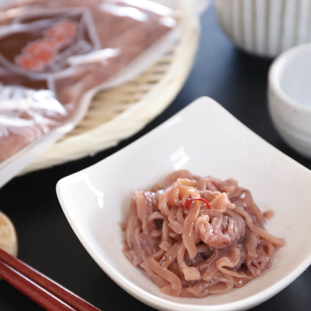 上野屋の塩辛はスルメにイカを使用しているので、イカの旨味がグッと凝縮されています。イカの食感とスルメの風味が口いっぱいに広がります。塩と麹をベースに、隠し味に唐辛子を加えることでほんのりとした辛味がアクセントになります。ごはんのおかずにも、晩酌のお供におすすめの一品です。 爆買