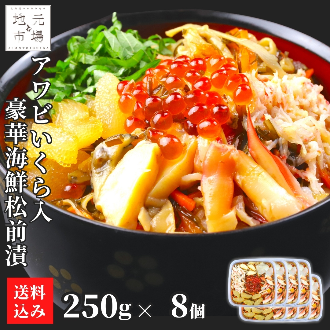 | 原材料 | 人参(国産)、数の子、しょうゆ、昆布、ほたて貝ひも、いか加工品(いか、砂糖、食塩)、ほたて、カナダほっき貝ひも、ずわい蟹、あわび、味付いくら(鮭卵、しょうゆ、米発酵調味料、その他)、たん白加水分解物、かつお節エキス、発酵調味料、食塩、水あめ/ソルビット、調味料(アミノ酸等)、pH調整剤、増粘剤(キサンタンガム)、酒精、(一部にかに・小麦・大豆・いか・あわび・いくらを含む) |