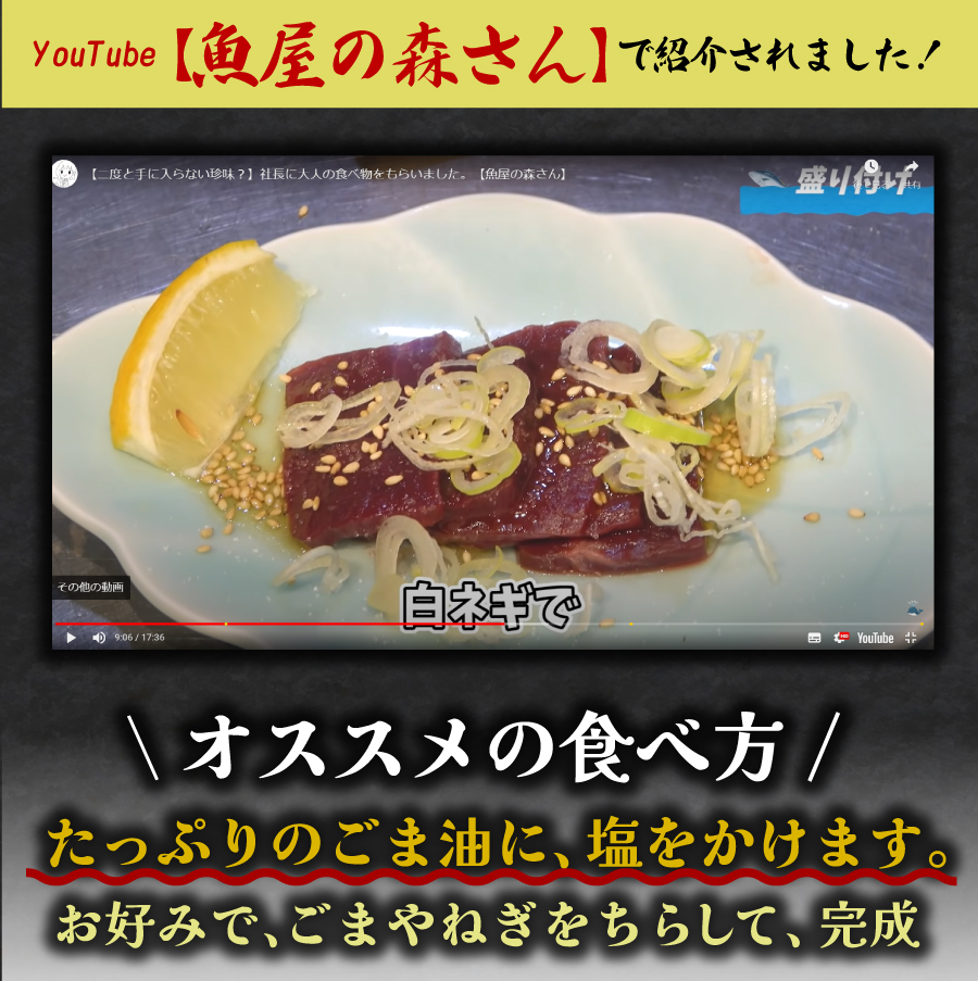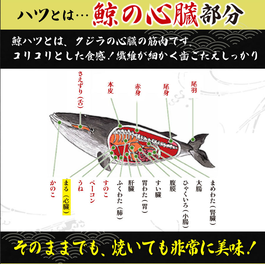 [原材料名]ナガス鯨舌肉(アイスランド)、食塩、乳たん白、還元水あめ、卵たん白、植物油脂、動物油脂、砂糖、増粘剤(増粘多糖類、酢酸デンプン)、pH調整剤、リン酸塩(Na)、コラーゲン、調味料(アミノ酸)、酸化防止剤(V、C、V、E)、保存料料(ソルビン酸K)、発色剤(亜硝酸Na)、くん液、(原材料の一部に豚、大豆が含まれています。)