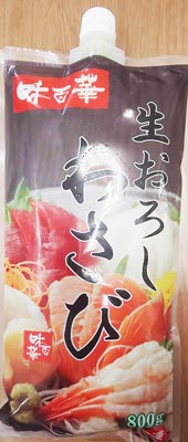 原材料:西洋わさび、本わさび、水あめ、植物油、酸味料、増粘多糖類、着色料(黄色4号、青色1号)、香料
