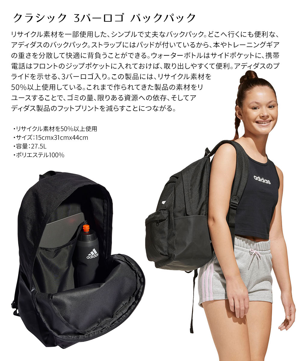 どこへ行くにも便利な、アディダスのバックパック。ストラップにはパッドが付いているから、本やトレーニングギアの重さを分散して快適に背負うことができる。