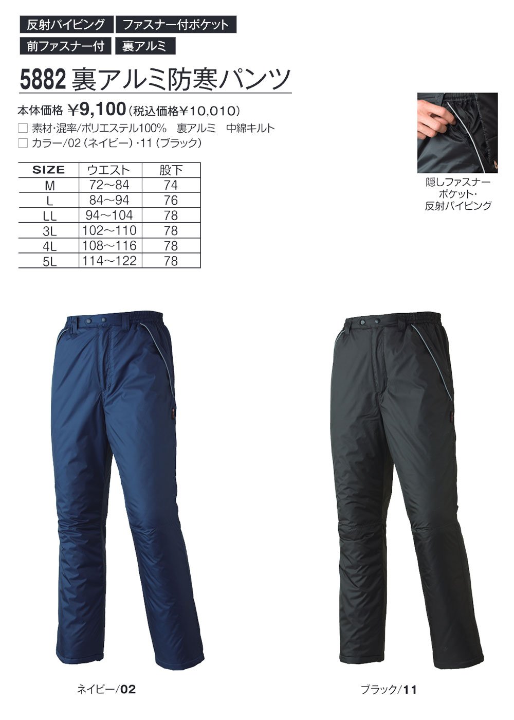 5882 裏アルミパンツ(反射パイピング・ファスナーポケット・前開き・裏アルミ)