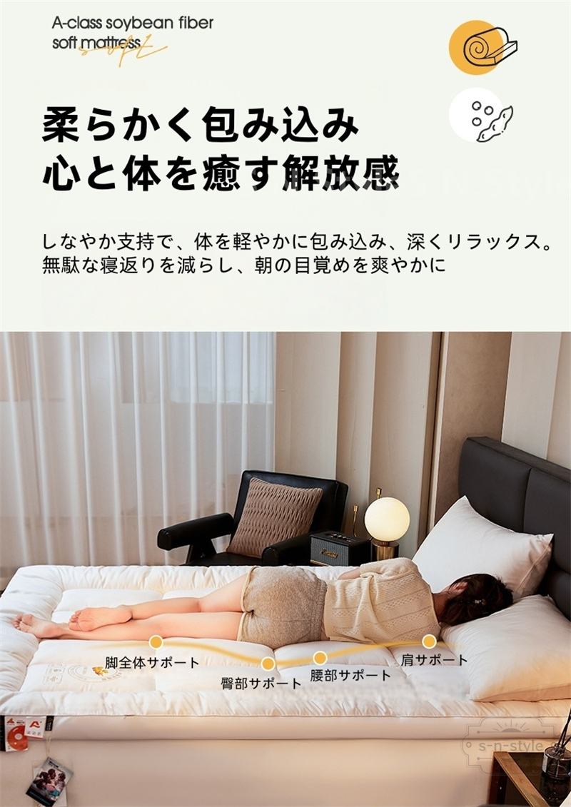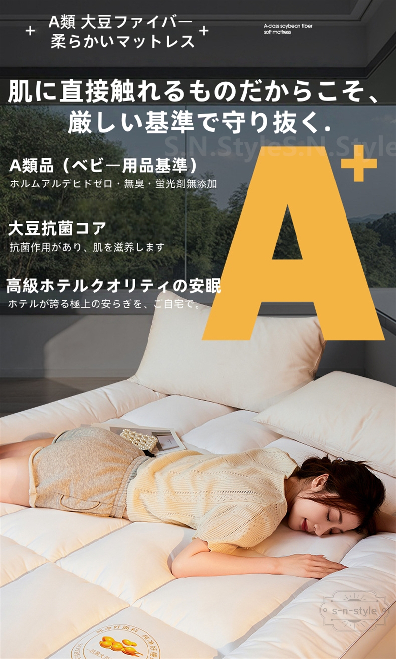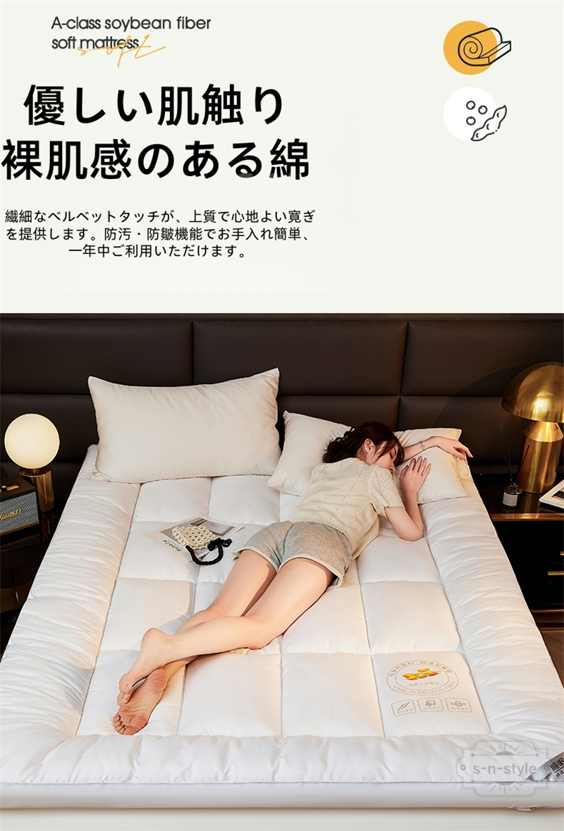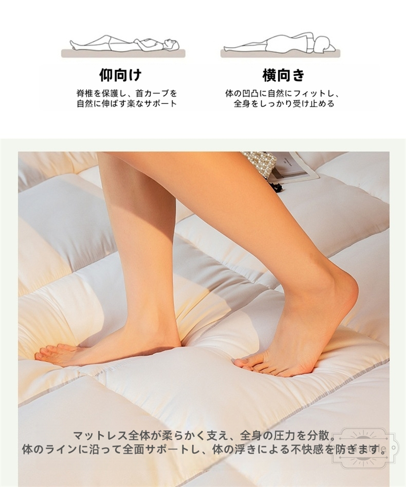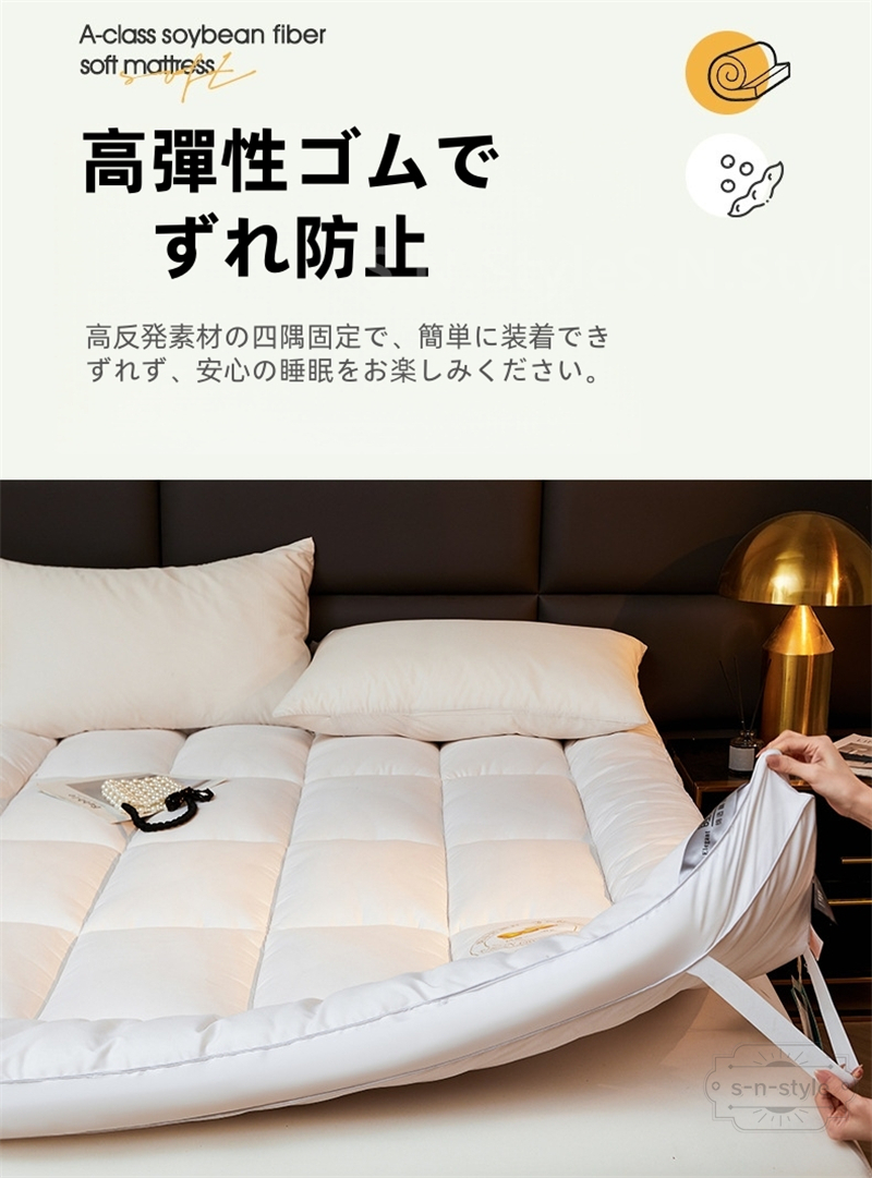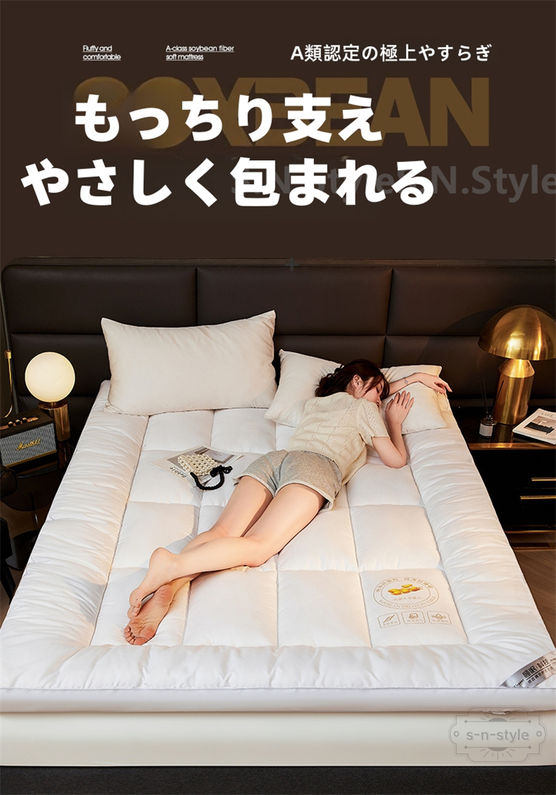【ファッショナブルなスタイル & プレミアム素材】マットレストッパーは、高密度編み起毛マイクロファイバーコットン混紡生地で作られており、均一な重量配分を実現する天然大豆繊維を使用しています。 マットレストッパーは柔らかくふわふわに見え、優れる柔らかさと快適さを提供し、究極の睡眠体験をもたらします。