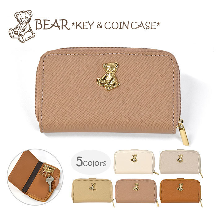 レディース 女性 小銭 小銭入れ コインケース コインポーチ ポーチ付き ラウンドファスナー カード カード収納 カード入れ カードケース コイン ポーチ キーポーチ パスケース 定期入れ 一緒 4連 コンパクト 大人 可愛い かわいい おしゃれ オシャレ 無地 シンプル 合成皮革 合皮 革 レザー 雑貨 小物 動物 アニマル グッズ 熊 テディベア モチーフ アイボリー グレー ベージュ ブラウン キャメル