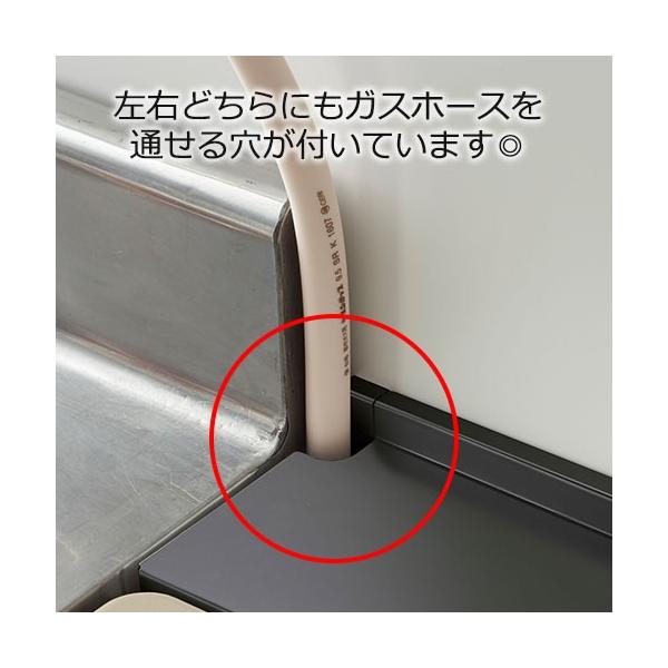 ガスホースを通せる穴付きです。また、棚板が上に開くので、設置したままガスの元栓の開閉が可能です。