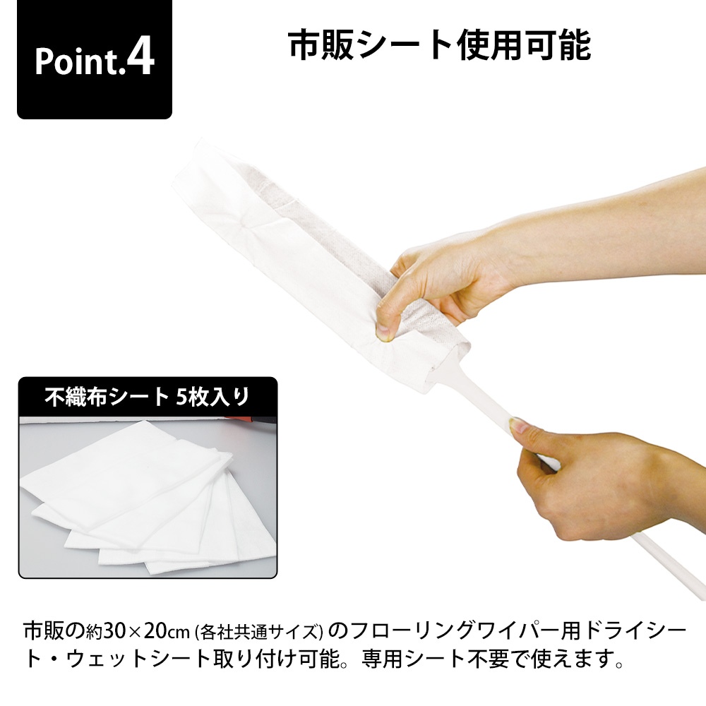 市販の約30×20cm(各社共通サイズ)のフローリングワイパー用ドライシート・ウェットシートを取り付け可能。