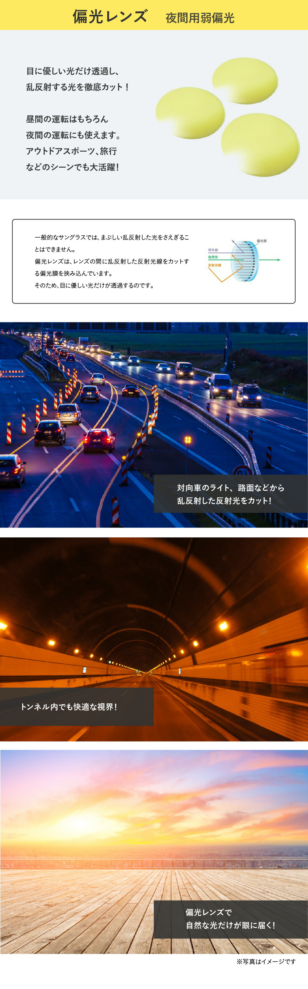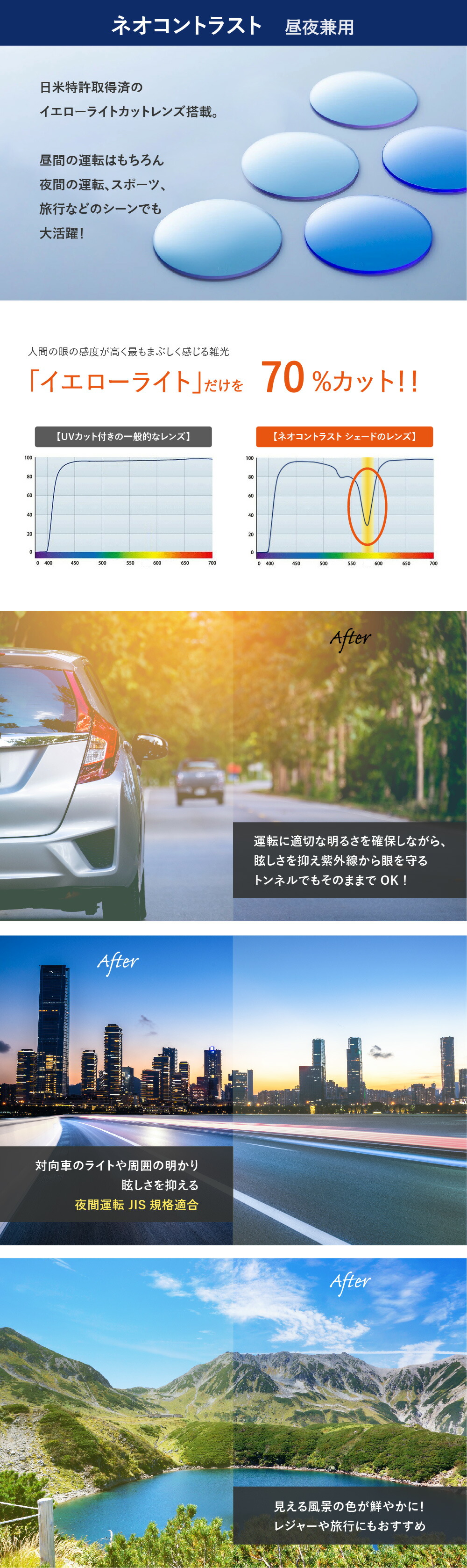 夜間、夕方、曇りにも使えるネオコントラストと、まぶしい太陽に強い偏光レンズ
