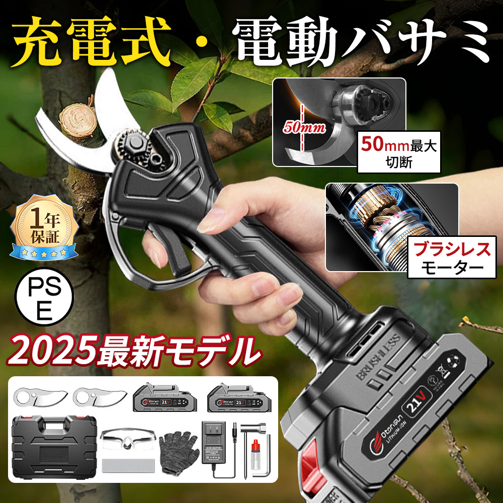 電動剪定ハサミはブラシレスモーター付きの新型電動ハサミ です。安定した性能、高速回転、優れ耐久性と長寿命の特性がります。直径10 20 30 50mmまでの切断が可能です。スーパーパワーで、太さ50mmの枝も1秒で切断できます。コードレス充電式剪定ハサミ、電源が不要であり、様々な場所で使用することができ、場所の心配がありません。