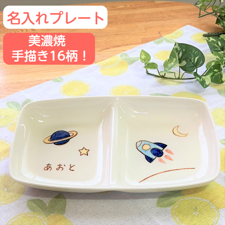 サチスタイルのオリジナルのクレヨンイラストが入った、子供用の食器です。全ての食器にお名前を入れてお作りします。当店オリジナルの二つ仕切りランチプレートです。人気NO.1アイテムです。