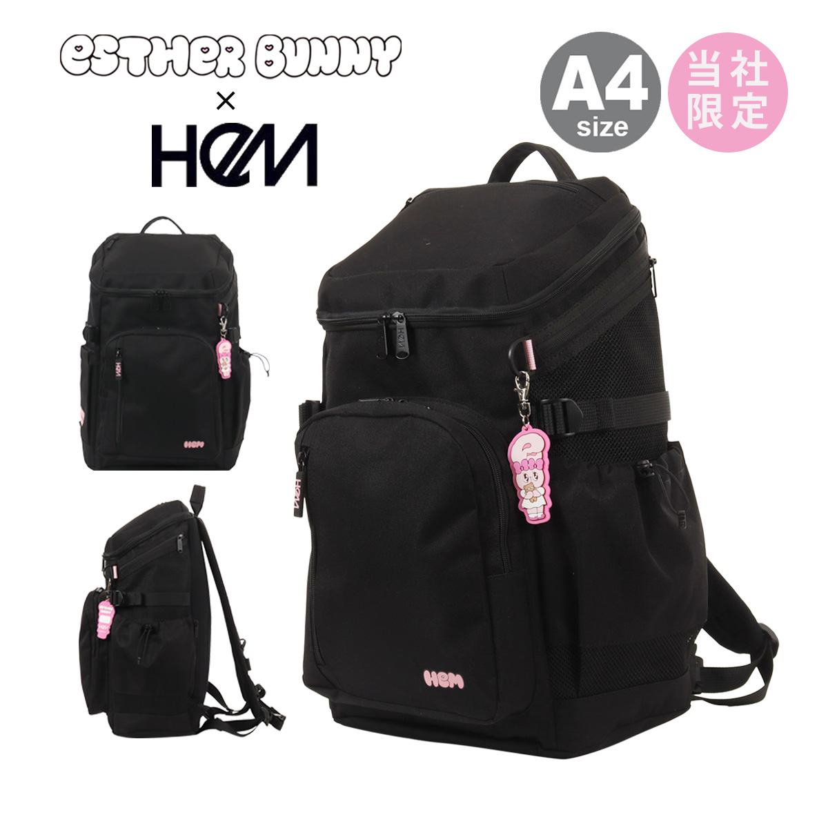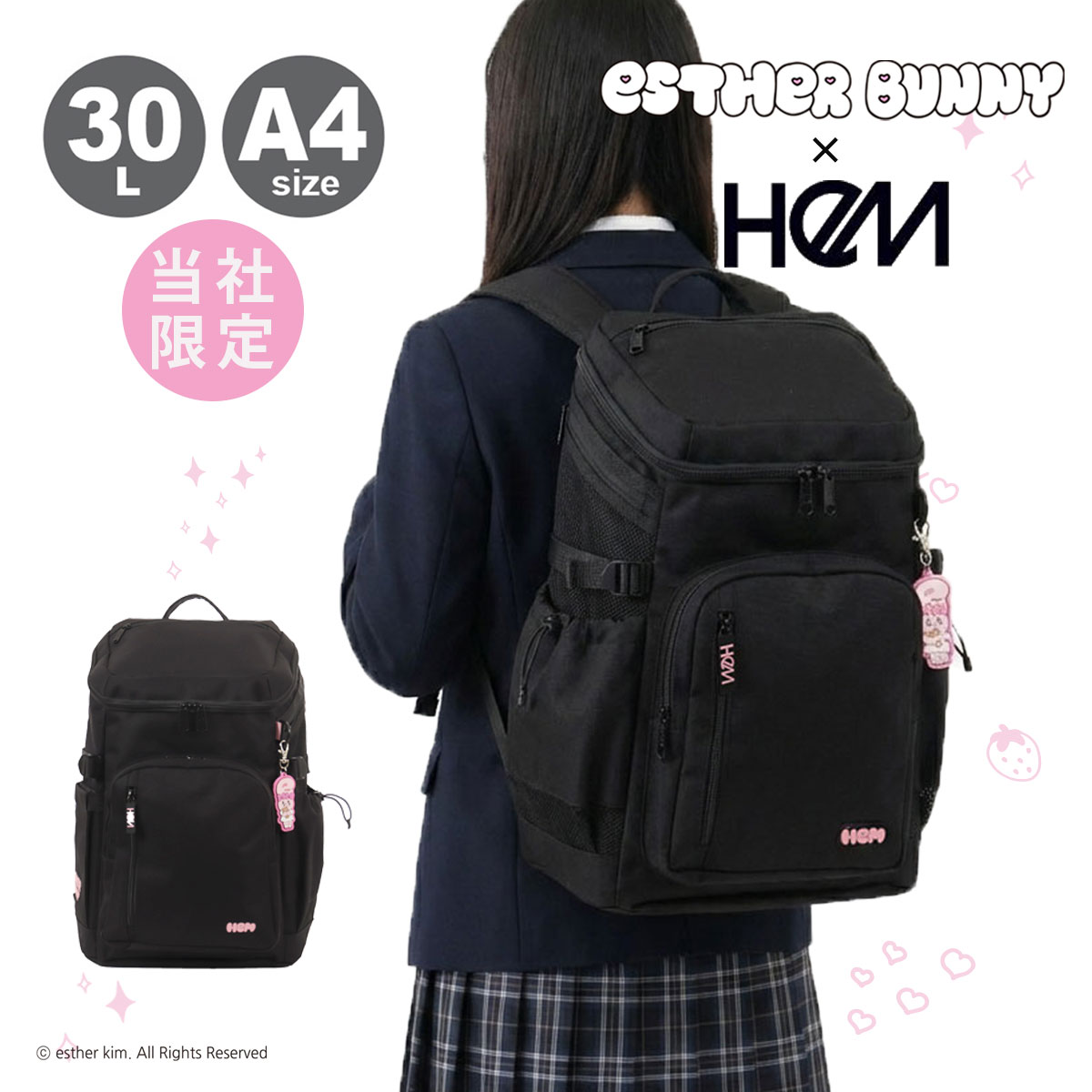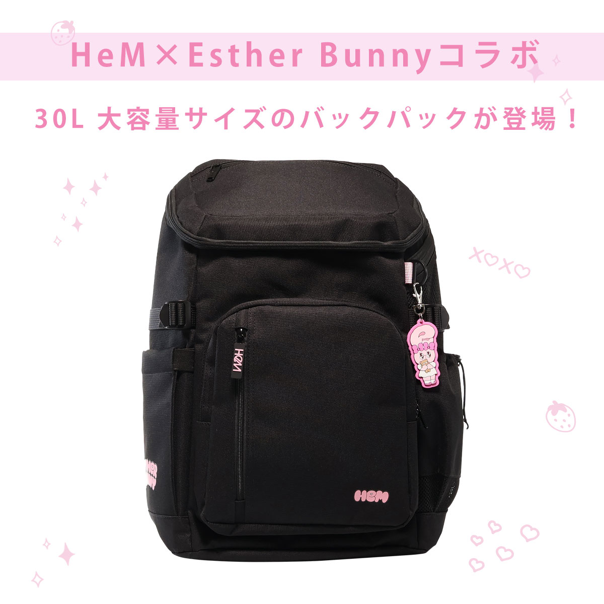 HeMの人気ボックスリュックがエスターバニーとコラボ。底面のHeMロゴにエスターバニーをあしらったオリジナルデザインとエスターバニーチャームがカワイイ♪PC&タブレット収納ポケットやパスケースなどの出し入れに便利な背面ポケット、フタつきのサイドポケットなど、いたるところにポケットが盛りだくさん!さらに、サイドに推し活に便利なメッシュポケットと、反対サイドの蓋つきポケット内にスマホポケットを追加。肩ベルトにはハンディファンを固定するためのゴムループを取り付けました!さらに肩ひもの長さ調整をしやすいようにストラップ端にDカンを、各ストラップにはまとめやすいようにストラップキーパーを付けています。撥水・抗菌加工生地を使用し、雨や汚れ、イヤなにおいを防ぎます。30Lの大容量で教科書や部活の荷物などをたっぷり収納出来ます。