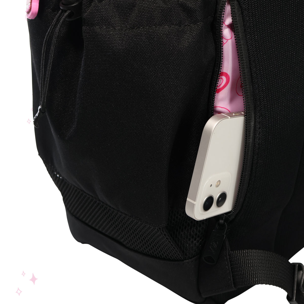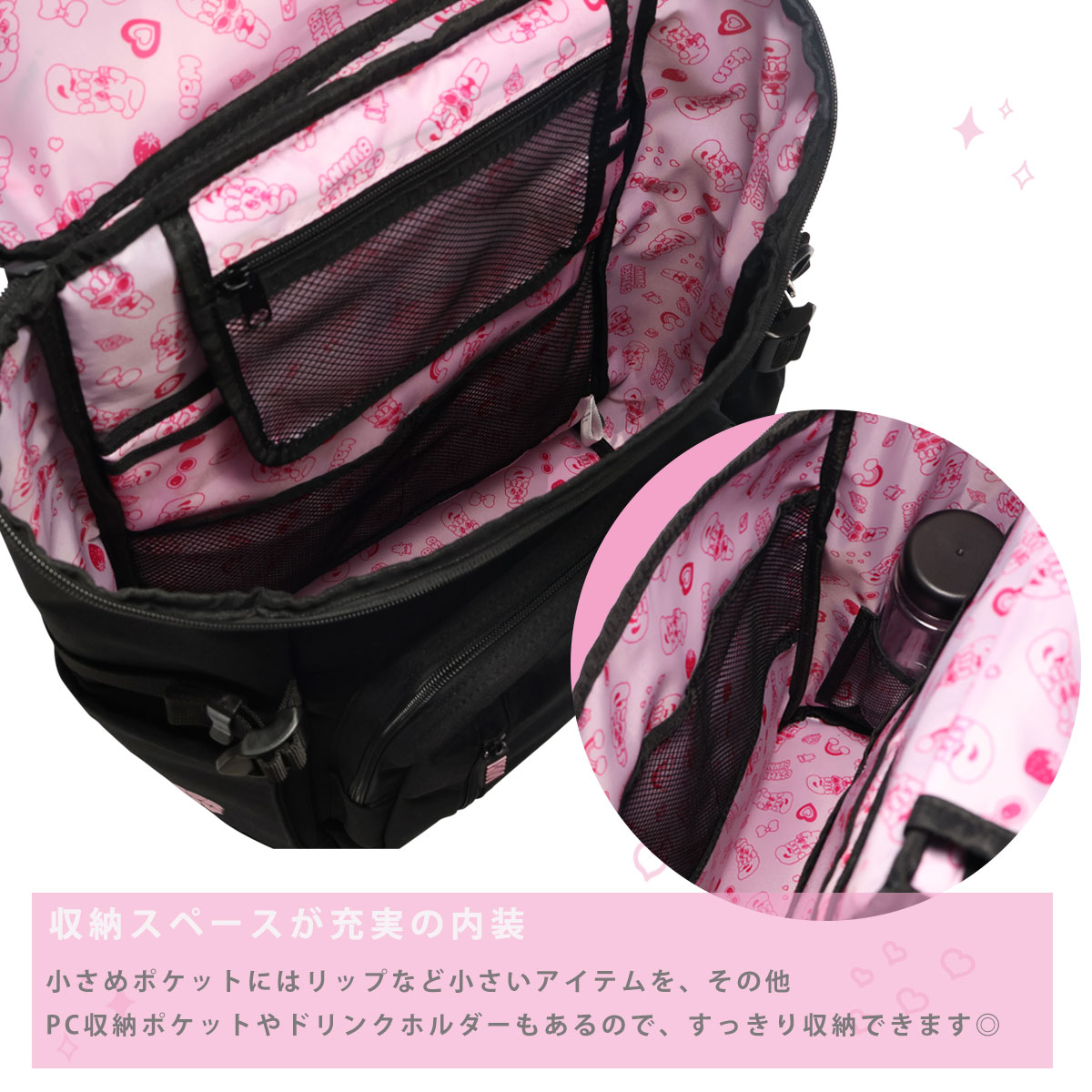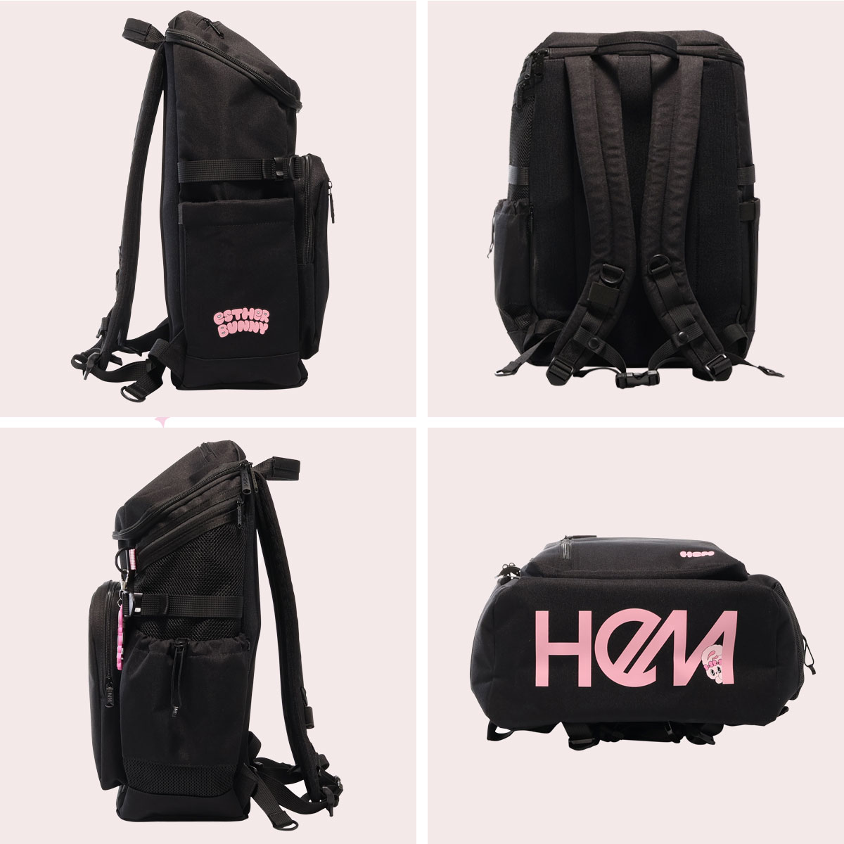 HeMの人気ボックスリュックがエスターバニーとコラボ。底面のHeMロゴにエスターバニーをあしらったオリジナルデザインとエスターバニーチャームがカワイイ♪PC&タブレット収納ポケットやパスケースなどの出し入れに便利な背面ポケット、フタつきのサイドポケットなど、いたるところにポケットが盛りだくさん!さらに、サイドに推し活に便利なメッシュポケットと、反対サイドの蓋つきポケット内にスマホポケットを追加。肩ベルトにはハンディファンを固定するためのゴムループを取り付けました!さらに肩ひもの長さ調整をしやすいようにストラップ端にDカンを、各ストラップにはまとめやすいようにストラップキーパーを付けています。撥水・抗菌加工生地を使用し、雨や汚れ、イヤなにおいを防ぎます。30Lの大容量で教科書や部活の荷物などをたっぷり収納出来ます。
