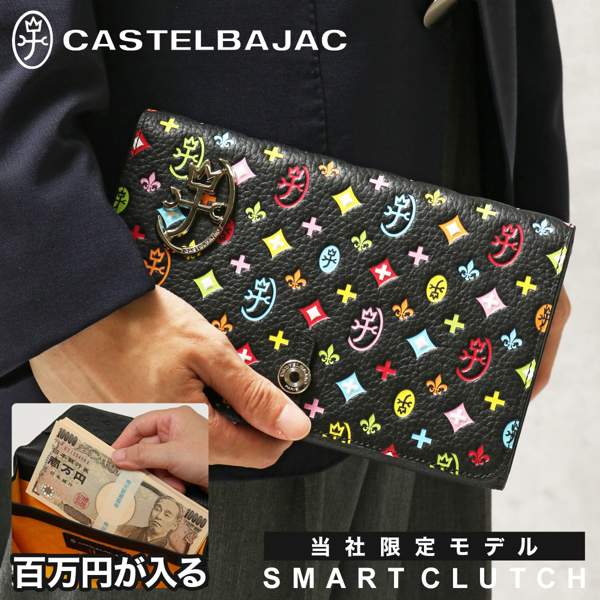 別注カラーのカラフルなモノグラム柄は、重厚感のあるシックなブラックカラーに映えるカラーリングで、大人の遊び心をくすぐります。内部のキーホルダーチェーンは別注だけの仕様となり、更に使い勝手が広がります。