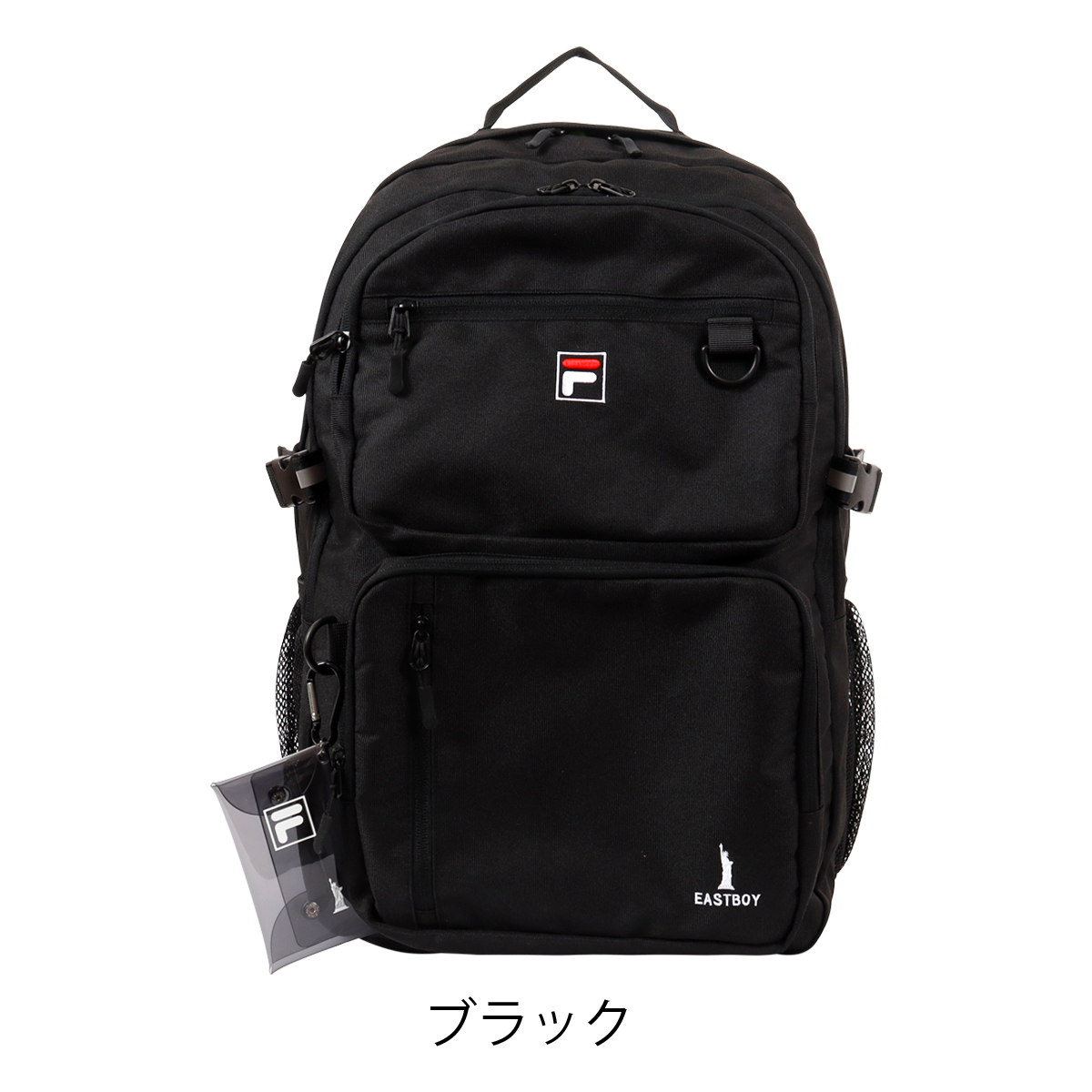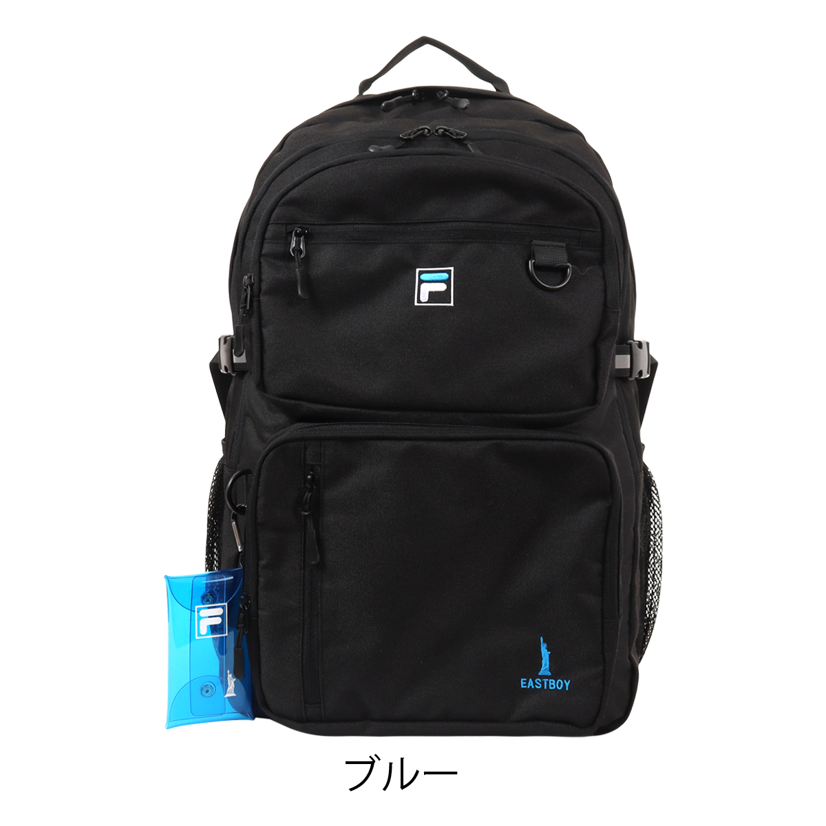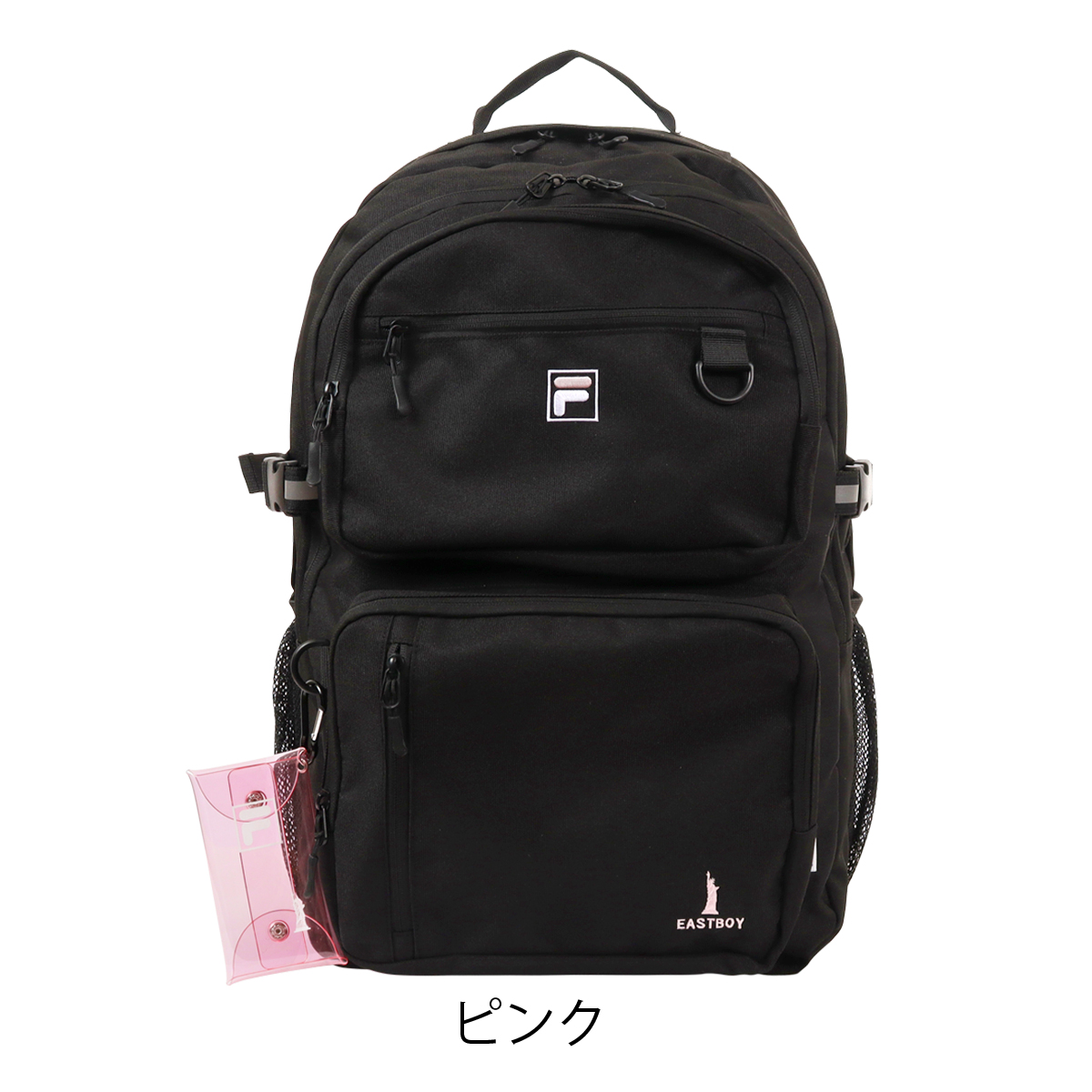 人気ブランド「FILA」「EASTBOY」のコラボリュックです。前面には大きな立体ポケットを上下に2つ、お財布やスマホなど便利に収納できるのファスナーポケット。両サイドにはペットボトルや折り畳み傘などが入るオープンポケット。内装部分には小物を小分けに収納できるオーガナイザーポケットなど収納力抜群のアイテムです。夜間の安全を配慮した反射素材を正面とショルダーベルトに使用しています。カラビナ付きミニクリアケースでさわやかでPOPな可愛らしい一面も。