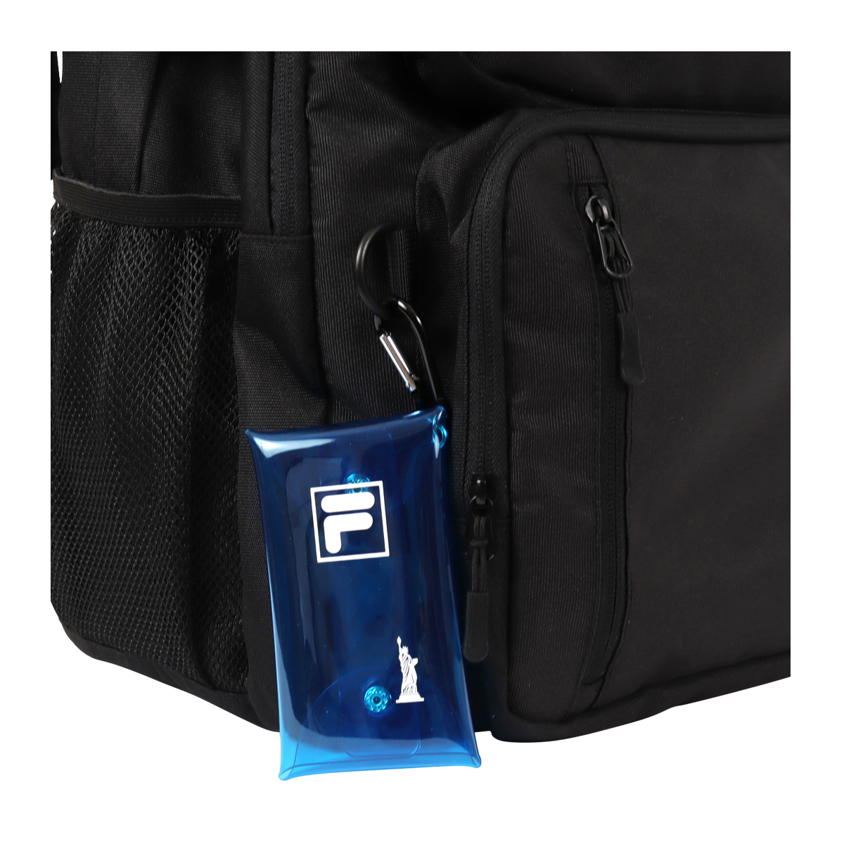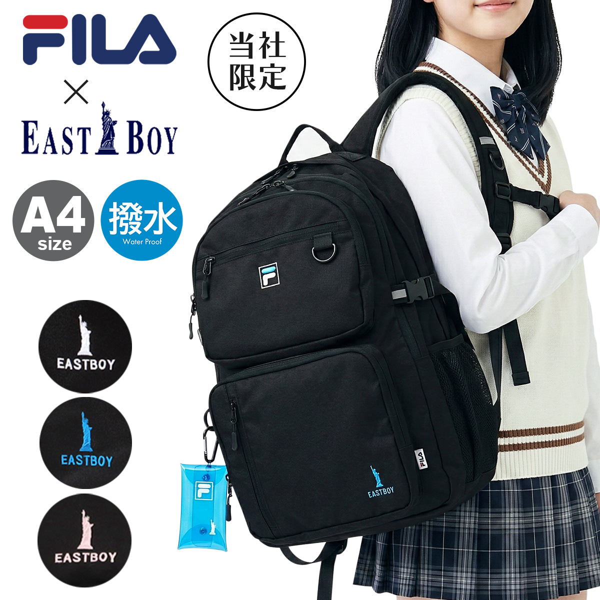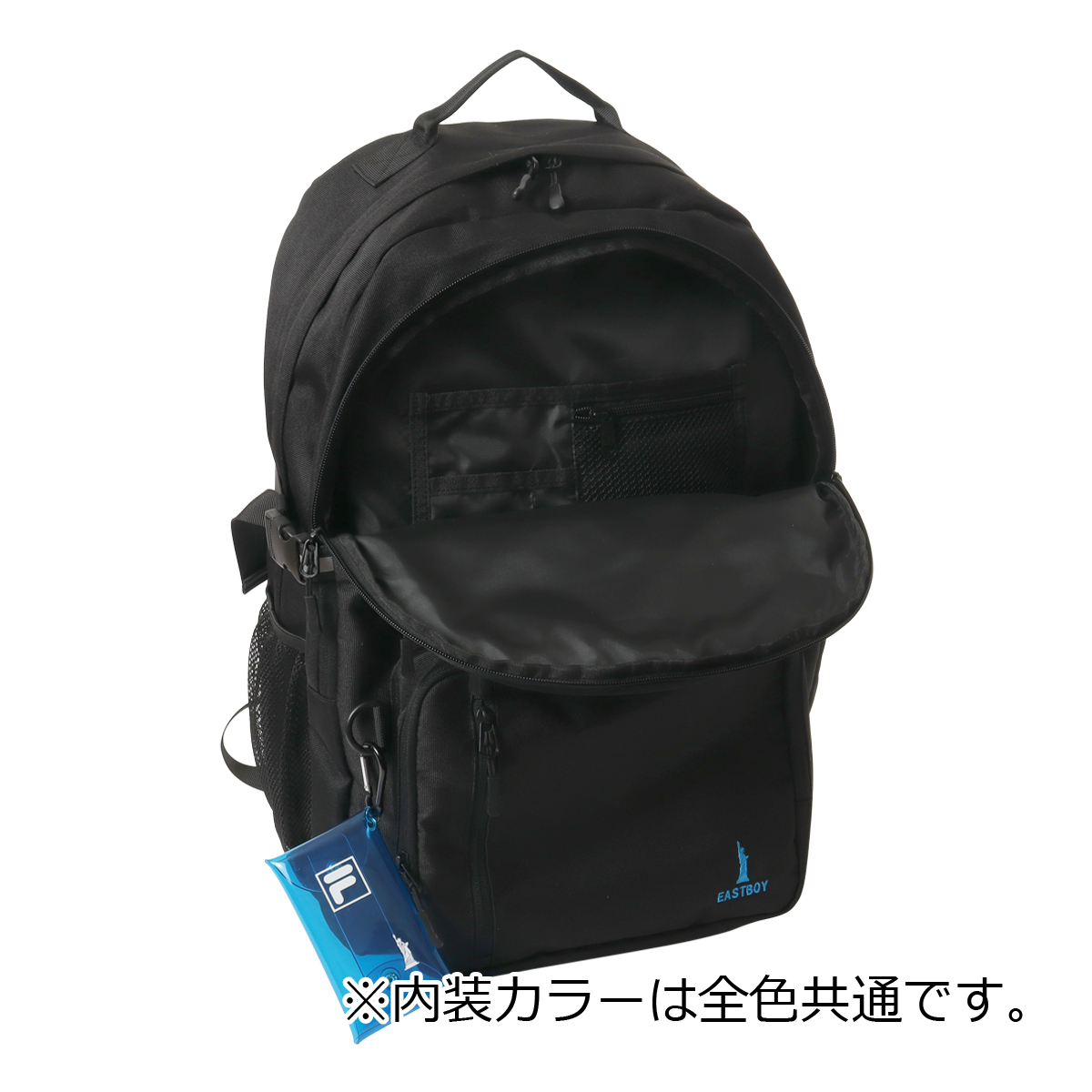 人気ブランド「FILA」「EASTBOY」のコラボリュックです。前面には大きな立体ポケットを上下に2つ、お財布やスマホなど便利に収納できるのファスナーポケット。両サイドにはペットボトルや折り畳み傘などが入るオープンポケット。内装部分には小物を小分けに収納できるオーガナイザーポケットなど収納力抜群のアイテムです。夜間の安全を配慮した反射素材を正面とショルダーベルトに使用しています。カラビナ付きミニクリアケースでさわやかでPOPな可愛らしい一面も。