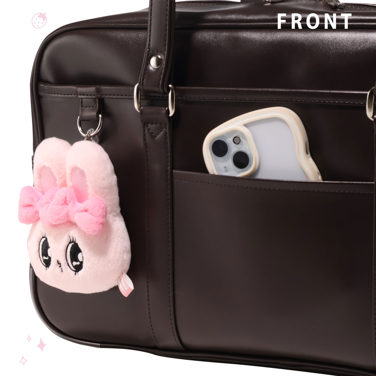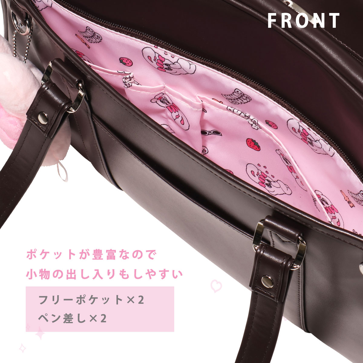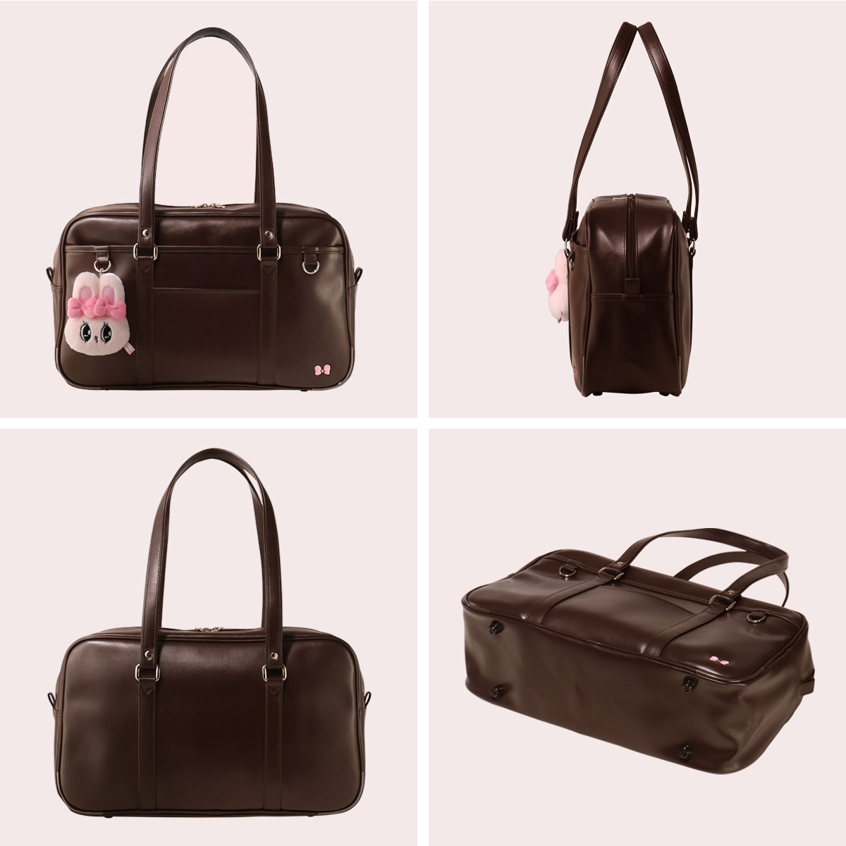本体前胴にはチャームが付けられるDカンが2点ついている令和仕様のスクールバッグです。
