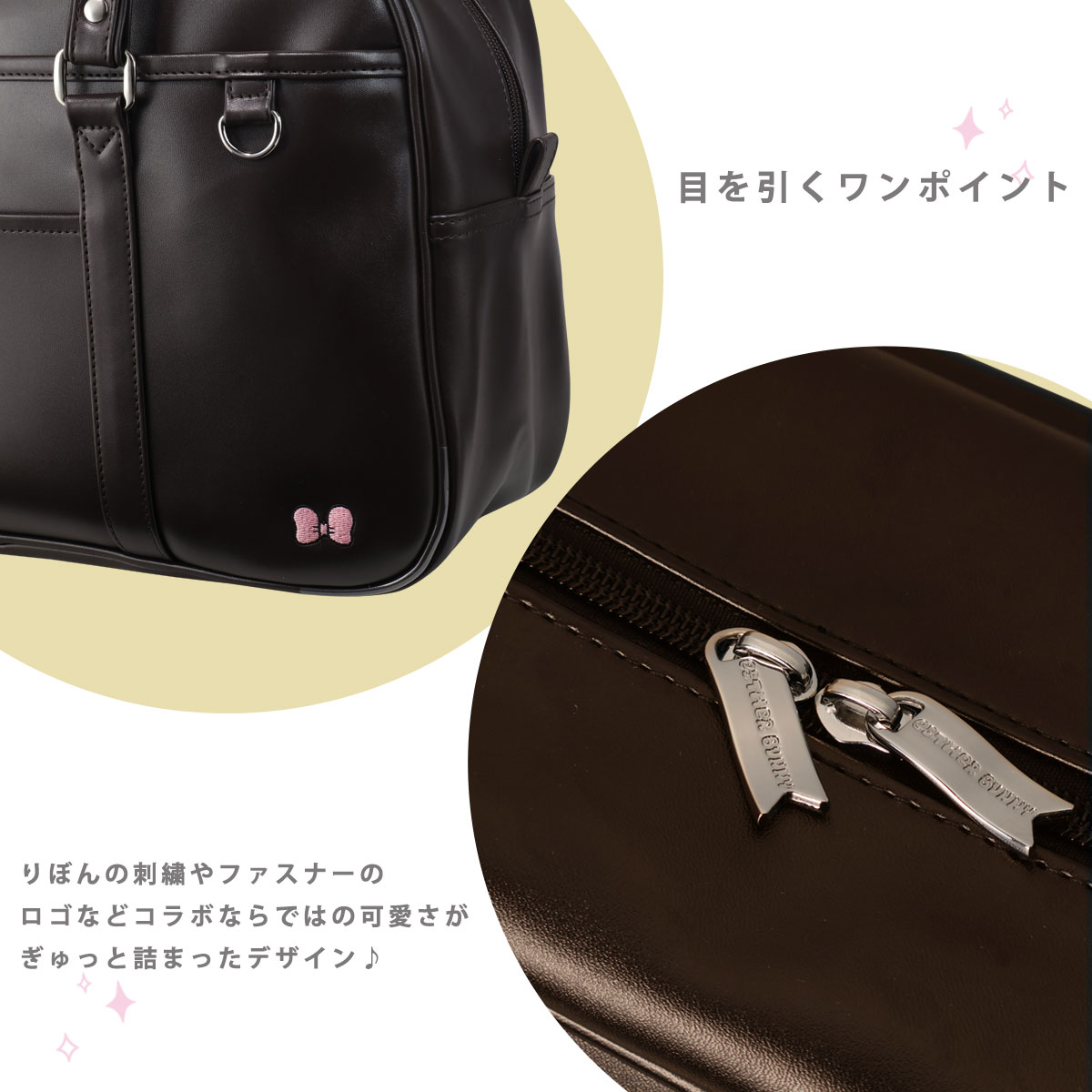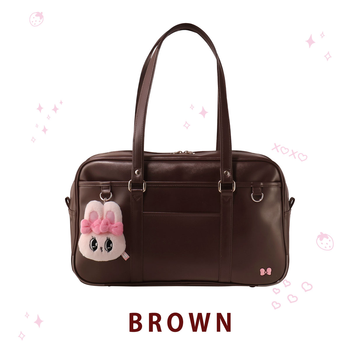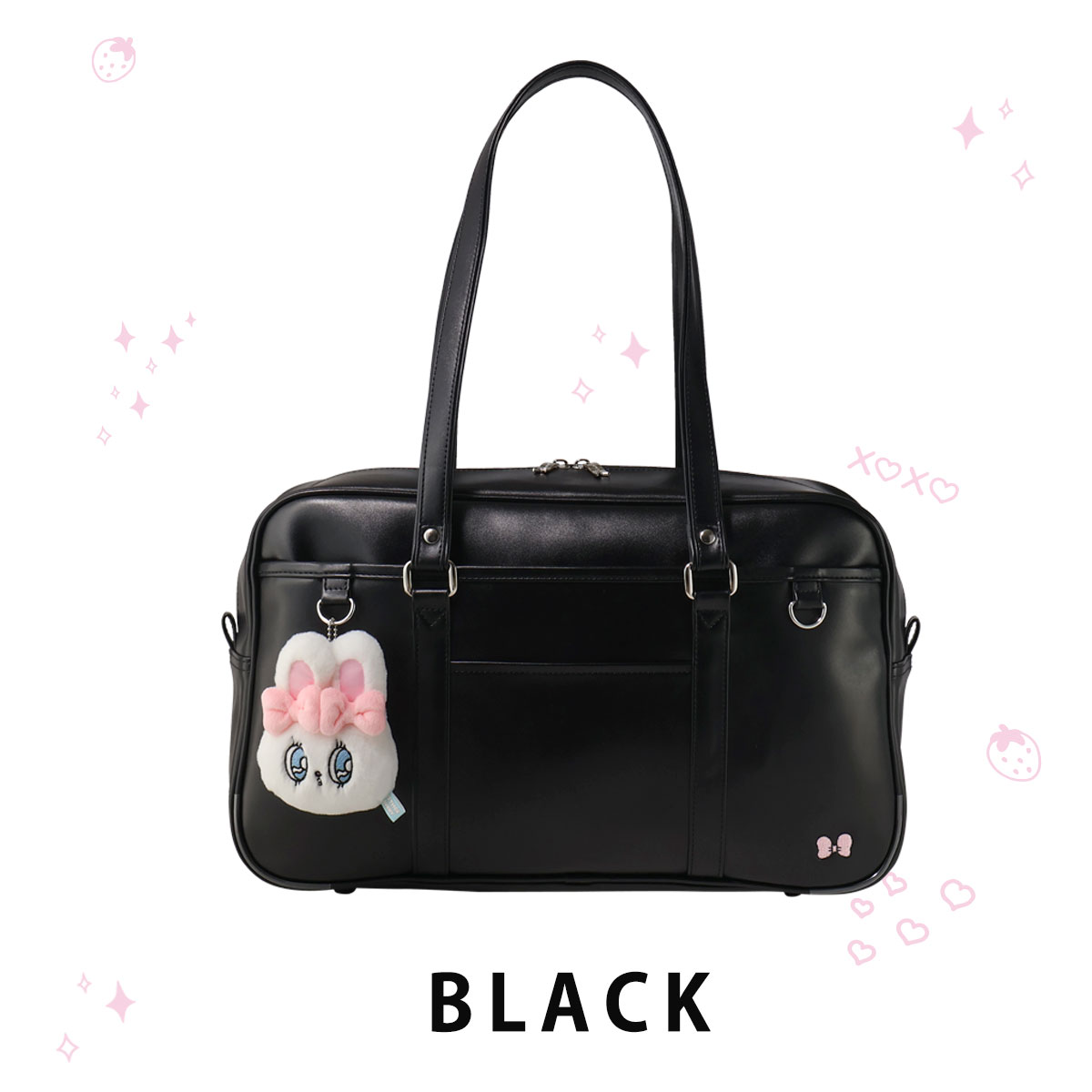 本体前胴にはチャームが付けられるDカンが2点ついている令和仕様のスクールバッグです。