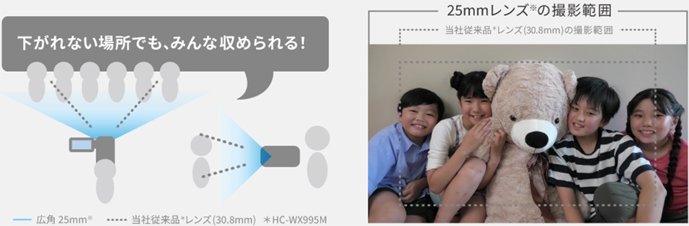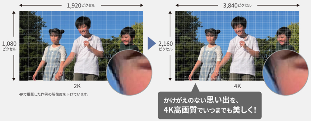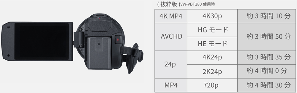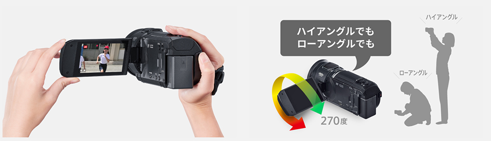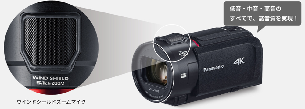 ![]() ◆定番のシーンを自動でキレイに 「おまかせiA」の自動認識が、5つの中からそれぞれシーンにあわせた補正を可能に。撮りたいものにカメラを向けるだけで、カメラがシーンを自動で認識して、最適な設定で撮影できます。 ![]() ◆光学24倍、iA48倍( 2K撮影時)のズーム撮影が可能 近くでわが子を撮影できなくても、高倍率で高性能なパナソニック独自のズーム機能が大活躍。遠くからは分からなかった顔の表情も撮り逃しません。 ![]() ![]() ◆「マルチアングルモニター」だから、ハイアングルもローアングルも自由自在 270度回転するモニターの角度を自由に変えられるので色んなアングルから撮影ができます。屋外撮影時、光でモニターが見にくい場合でも角度を変えて見やすく調節できます。 ![]() ◆液晶モニターを開いて約1秒で撮影可能な「クイックパワーオン」 「クイックパワーオン」を設定しておくと、電源が切られた状態から、スピーディに撮影可能状態に入ることができます。 ![]() ◆「撮れていなかった」撮影ミスや撮り逃しを減らせる 録画ボタン押し忘れて撮影できていない。撮り直しができない一度だけのタイミングを逃さないために、REC(撮影)/PAUSE(停止)をお知らせ表示。撮影の失敗も防げ、安心して撮影できます。 ![]() ◆動きながらの手ブレしやすい撮影でも、ブレを自動で抑えた映像に 走り回るわが子を自分も動きながら撮影していると、その動きに合わせて映像もブレてしまいますが、回転軸・左右・上下・縦回転・水平回転の5軸方向の手ブレを自動で補正してくれる「5軸ハイブリッド手ブレ補正」を搭載しているので手ブレを気にせず安心して撮影できます。 ![]() ◆4K高精細な映像で思い出を残そう 運動会などわが子の大切な思い出を、4K30pに対応のVX3でいつまでも美しく記録しておけます。 4Kの画質は2Kの約4倍の高解像度を誇り、運動会や発表会などの学校行事をはじめ、わが子の成長していく姿や家族旅行の楽しい思い出などを、高精細な映像で残せます。 ![]() ◆高性能センサー・明るいレンズで高感度・高画質撮影が可能 1/2.5型センサーとF値1.8-4.0レンズを搭載しているので、夕景・夜景・ 暗い室内などの暗い場所でも、明るくノイズの少ないキレイな映像が撮影できます。 ![]() ◆距離をとれない撮影でもみんなを一緒に収めやすい 集合写真などで、お部屋の中で後ろに下がれないような場面でも、広角25mmレンズ※を搭載しているので、わが子やお友達、家族などを一緒に入れた撮影が可能。 家族旅行などでも、近い距離から広い範囲を撮影できるので、家族みんなを一緒に収めやすく便利で快適な撮影が可能です。 ![]() ◆走っているわが子にも、すぐにピントが合ってボケない 速く走っているわが子の動きや位置に合わせて自動で素早くフォーカスしてくれるので、焦点が合わずにボヤけた映像になる瞬間が短く、動いていてもなめらかな映像で記録できます。 ![]() ◆スーパースローを使って、感動的にスロー再生ができる 肉眼では見えなかった子どもの決定的な瞬間を、スローモーション再生で見られる「スーパースロー」を搭載。 2倍のハイスピードで撮影して、本体再生時にさらに2倍補間することで、1/4倍速(本体再生時)のドラマチックな映像を楽しむことができます。 ![]() ◆風景もマクロ撮影も高精細でキレイな「静止画記録」が可能 写真撮影モードで、高精細写真記録が可能。 緻密なディテールも鮮明に描写し、大判プリントをした際にも、キレイな静止画が楽しめます。きれいな写真もムービーも撮れるので旅行など2台持ちが不要で便利です。 ![]() ◆高性能マイクとシーンに適した設定で、音声を高音質に記録できる オーディオ向け高音質部品の採用と、効果的に風雑音の発生を抑圧する「ウインドシールドズームマイク」搭載により、高音質を実現。 さらに、撮りたいシーンに適した音質を6種のメニュー設定(オート・音楽・スピーチ・自然・お祭り・お好み)から選べる「サウンドシーンセレクト」も搭載し、より臨場感あふれる音声での撮影が可能です。 ![]() ◆撮影日時を動画とともに記録できる「タイムスタンプ機能」 動画と同時にいつ撮影したかも記録できるタイムスタンプ機能搭載で用途の幅が広がります。(静止画撮影には対応していません) ![]() ◆連続記録撮影時間 約3時間10分(4K MP4モード時)、約3時間50分(HGモード時)の連続記録撮影ができます。 ![]() ◆モバイルバッテリーで充電できる 付属のUSB Type-C接続ケーブルを使って、ACアダプター(付属)やパソコン、モバイルバッテリーなどとつないで、充電が可能です。 旅先など移動中にモバイルバッテリーでこまめに充電すればいざという瞬間を撮り逃すことがなくなります。 ![]() < 製品スペック > ・撮像素子:1/2.5型MOS固体撮像素子 ・有効画素数:動画時 4K:829万(16:9)/ 2K:617万(16:9) 静止画時 829万(16:9)/ 622万(4:3) ・ズーム:iAズーム 4K:32倍、2K:48倍、光学ズーム 、デジタルズーム:70倍/250倍 (Max.値は、2段階設定可能) ・記