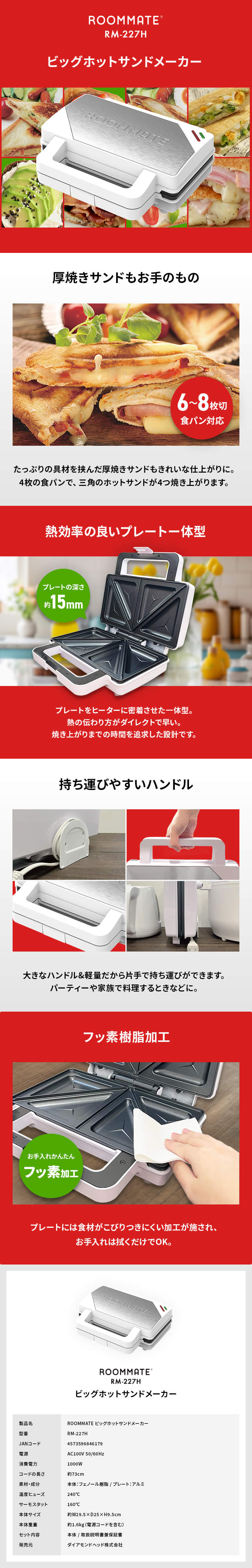 ROOMMATE ビッグホットサンドメーカー パンの耳まで焼ける 簡単調理 朝食 ランチ おやつ キャンプ アウトドア 具だくさん対応 厚焼き コンパクト RM-227H