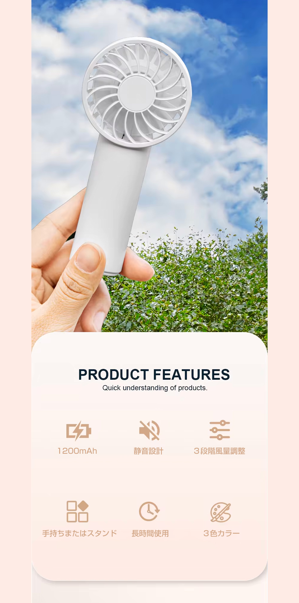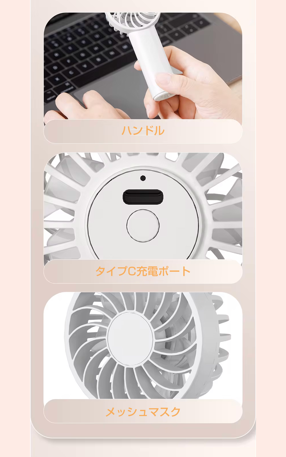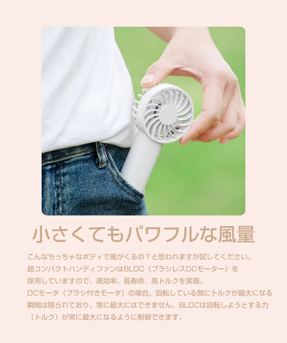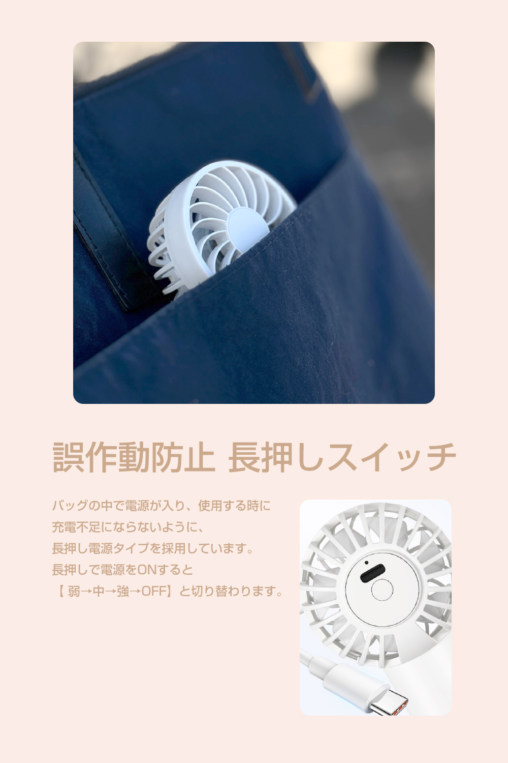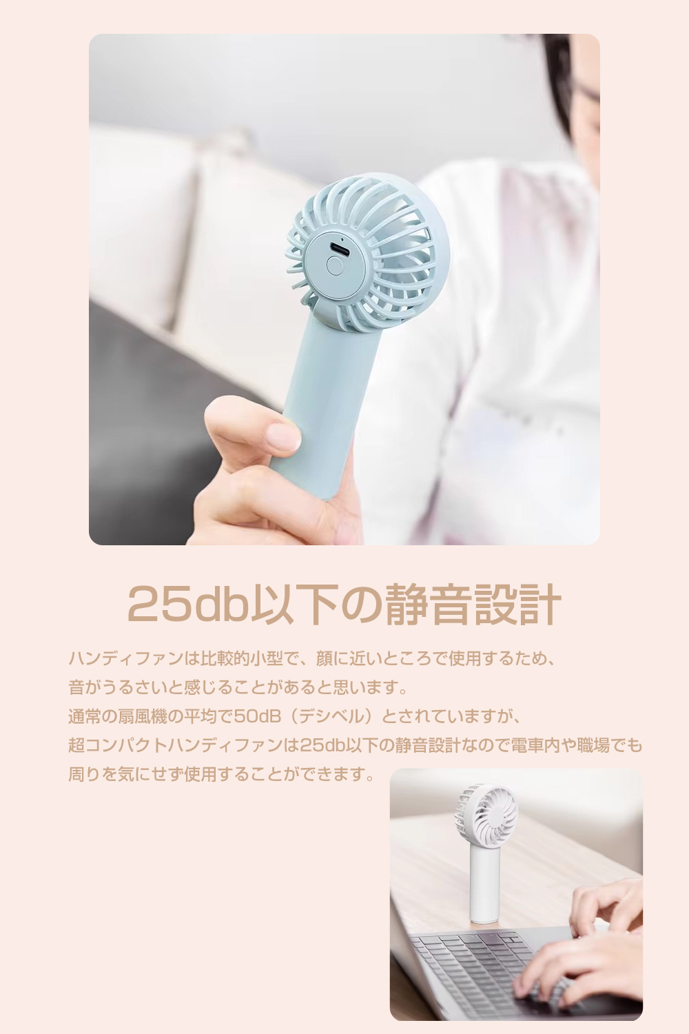 コンパクトで持ち運び便利なハンディファン。静音設計で快適な使用感を提供し、パワフルな風量で暑い季節を快適に過ごせます。USB充電対応でどこでも使える便利な携帯扇風機です。