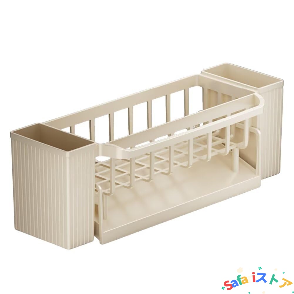 【大容量&多機能収納でキッチン整理が楽々】:メインスペースには食器やカップを立てかけ可能。サイドにはスポンジ、ブラシ、削皮器、水槽蓋など細かいアイテムを収納できる専用ホルダーを装備。無駄なスペースをなくし、キッチン周りをスッキリ整理できます