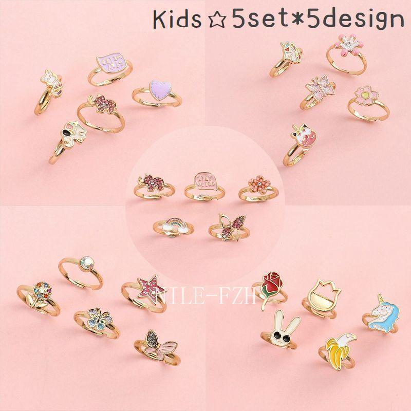 指輪 キッズ 女の子 子供用 アクセサリー ファッション小物 5点セット リング アニマル フラワー バタフライ ユニコーン キラキラ かわいい