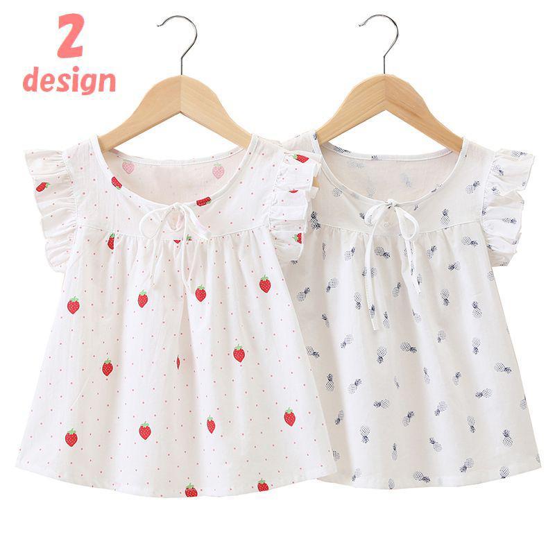 ブラウス シャツ 子供用 キッズ 女の子 トップス ラウンドネック 半袖 袖フリル プリント イチゴ ストロベリー パイナップル フルーツ柄 胸切替し