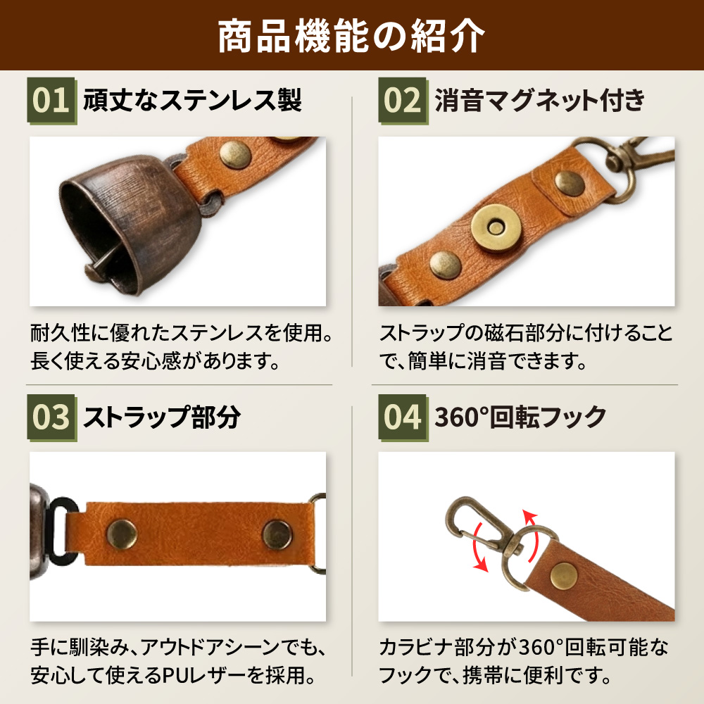 熊鈴 熊よけ鈴 消音機能付き 2個 ブラウン ブラック マグネット 磁石 カラビナ 消音 PUレザー 対策 鈴 登山 ハイキング くま クマ 鹿 EVERSAFE メール便3個まで