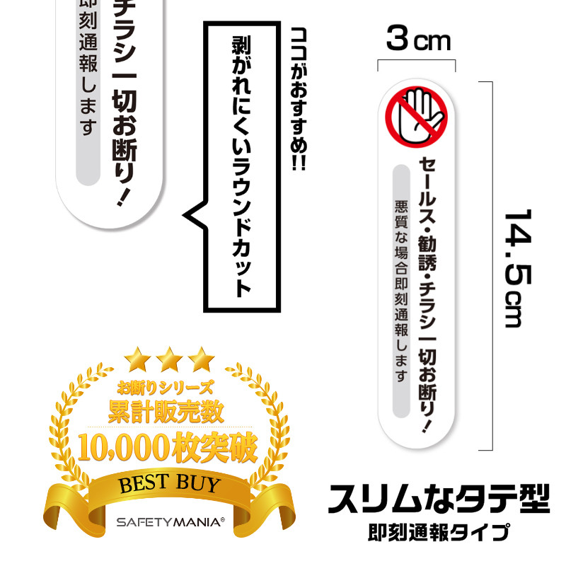即刻通報が効く セールス チラシ 勧誘 一切お断り ステッカー タテ型 2枚組 玄関 ポスト 強粘着 マット加工 防水 日本製 SAFETY MANIA