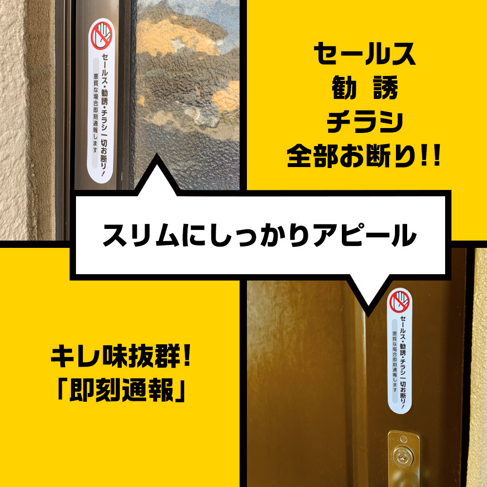 SAFETY MANIAオリジナルの「セールス 勧誘 チラシ投函一切お断り」ステッカーです。はっきりとした文字と警告イラストで注意をうながし、悪質な場合は「即刻通報」することを明記し、無用なトラブルを未然に防ぎます。