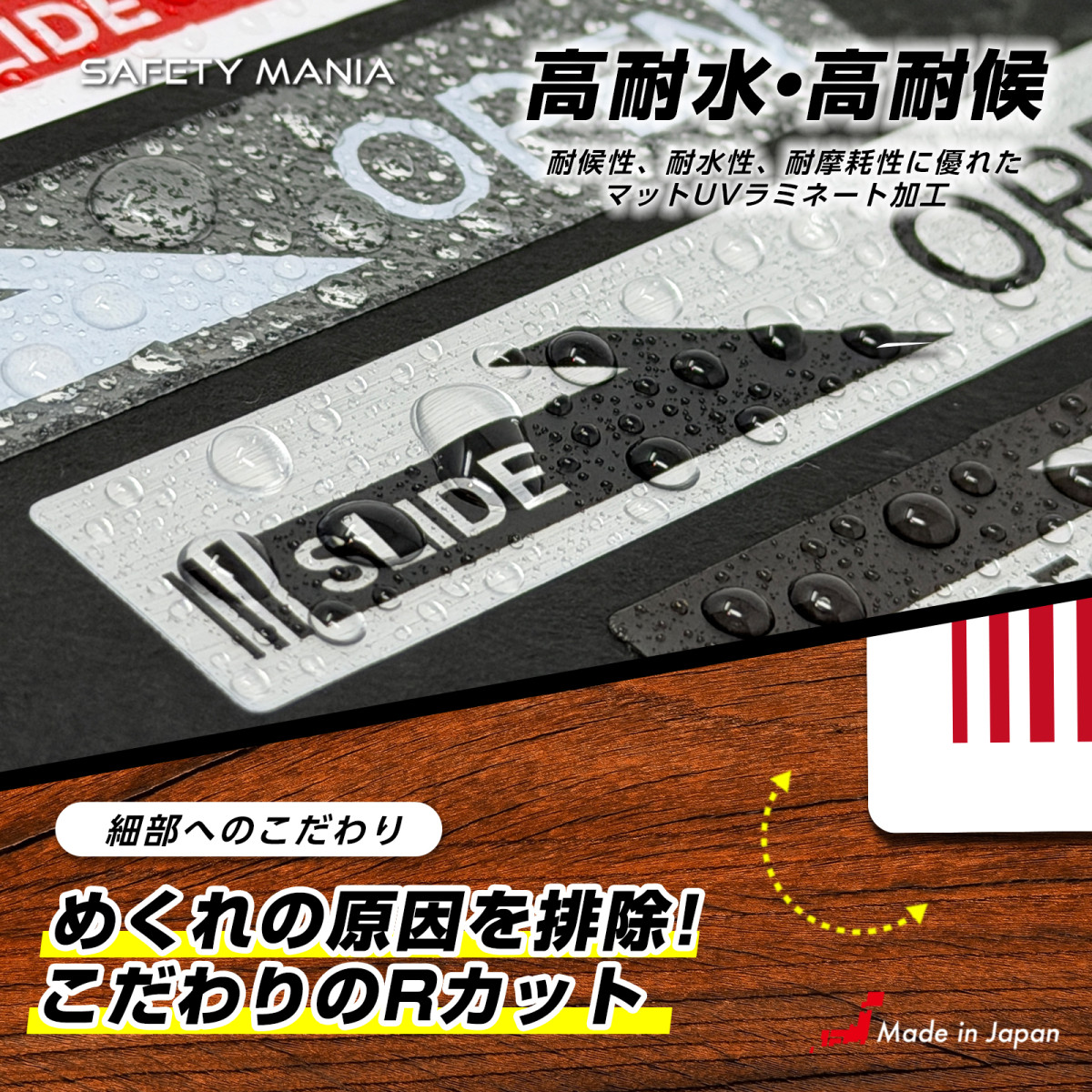 Rカット加工: 角を丸くカットすることで、剥がれの原因となる「めくれ」を防止。