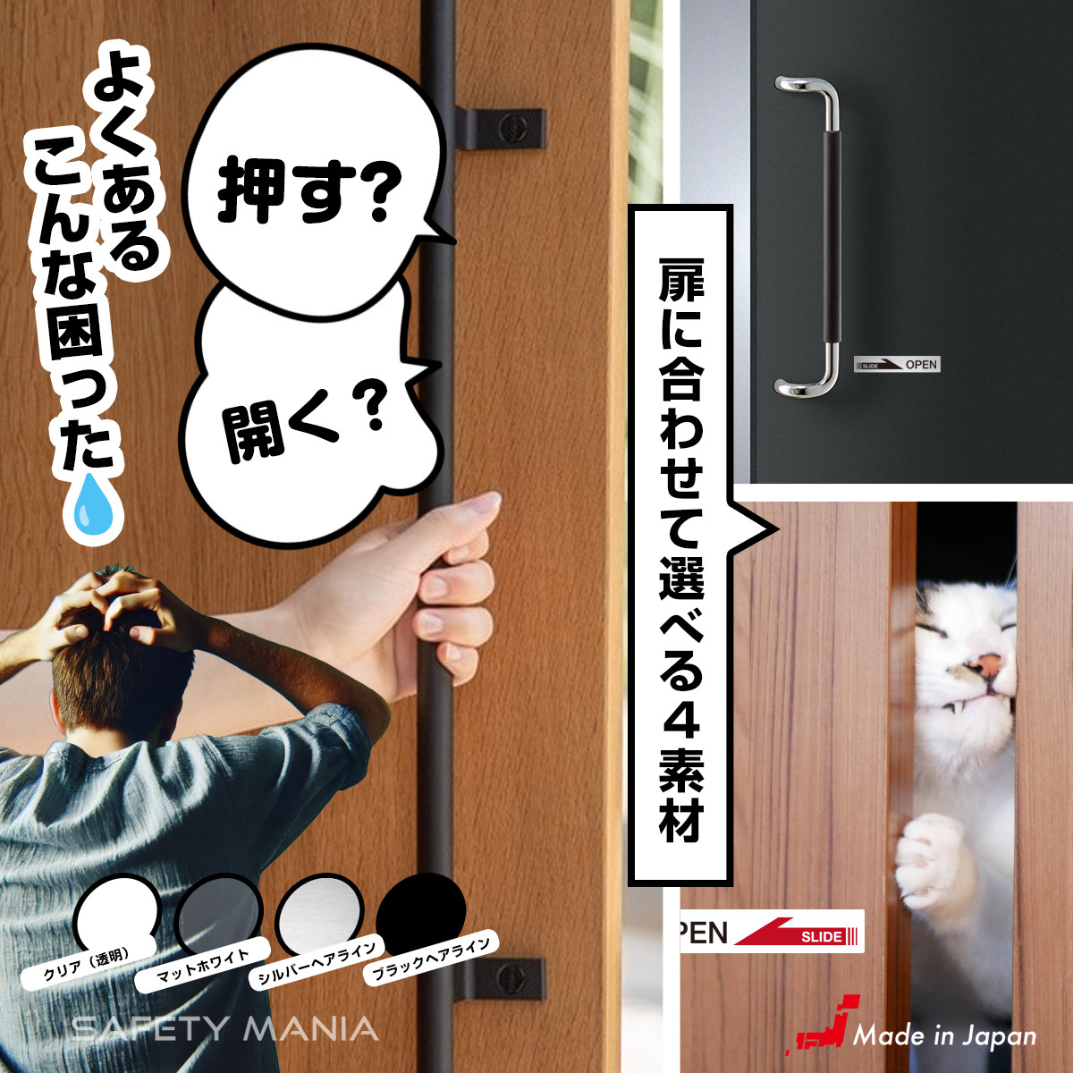 シンプルで直感的な英語表記(OPEN / SLIDE)と矢印のデザイン。外国人観光客にも開閉方向が一目で伝わるため、ホテルや民泊、店舗、玄関など、あらゆる場所のインバウンド対策に貢献します。