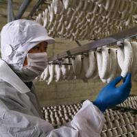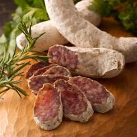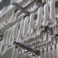 カマンベールチーズと同系統種の白カビで1ヵ月熟成させた希少な粉雪サラミ。ヨーロッパでは古くから食す文化がありますが、日本では希少な国産の白カビサラミです。白カビで熟成させることでお肉のタンパク質が分解され、芳醇な香りとトロッとまろやかな味わいを生み出します。口の中で醸し出すコクのある熟成味はえもいわれぬ未知の味覚を教えてくれるでしょう。ゆっくりと時間をかけて味わうことで、その深い味わいを存分に楽しむことができます。