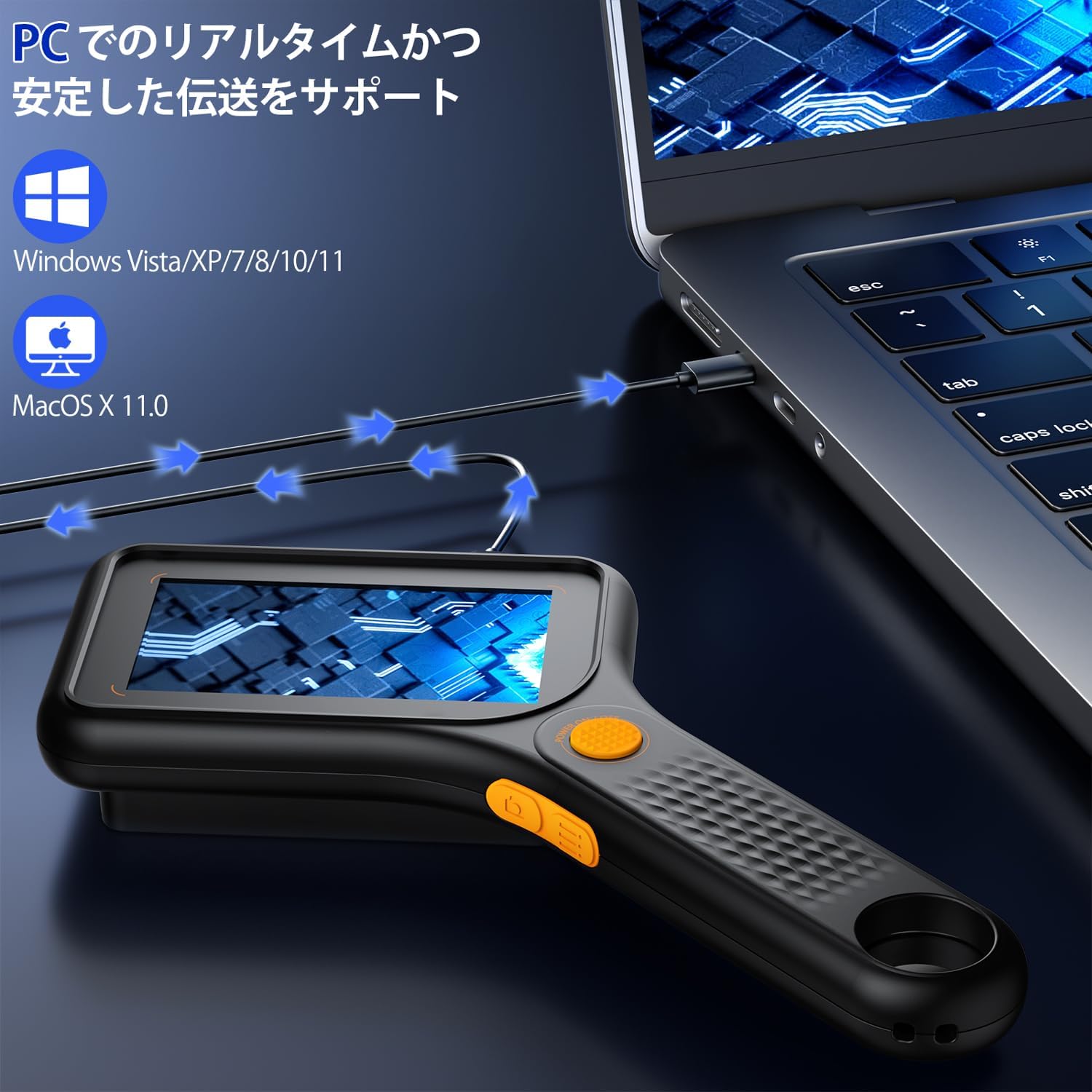 内蔵メモリに約100枚の画像を直接保存できます(※他デバイスでは認識不可)。動画録画には別途microSDカード(最大64GB対応、別売)が必要です。付属のType-C USBケーブルでPC(Windows Vista/XP/7/8/10/11、macOS X 11.0以上)に接続可能で、大画面でのリアルタイム観察や画像確認ができます。基板検査やはんだ付け作業のサポートツールとしても便利です。