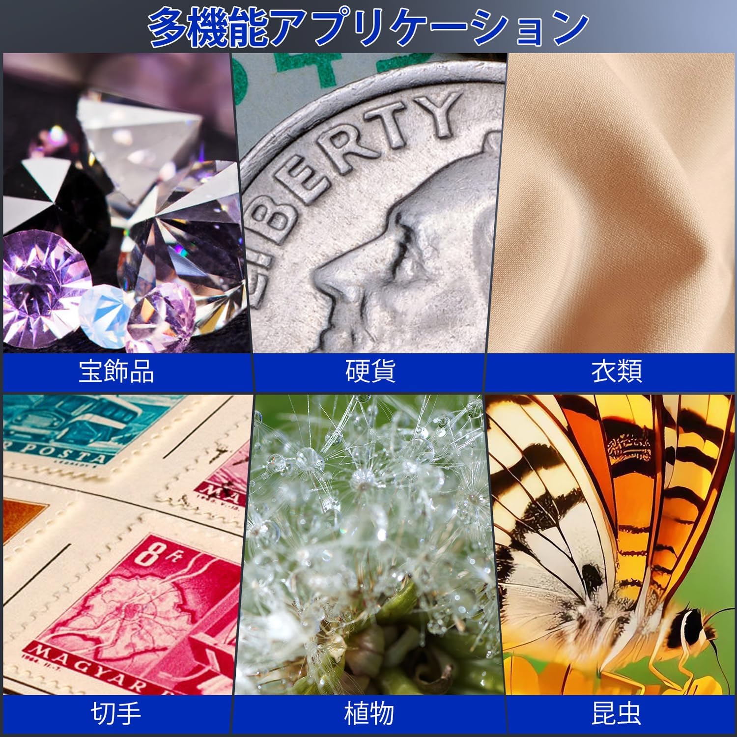 本体周囲に8個のLEDライトを搭載し、3段階で明るさを調整できます。昼間はもちろん、暗い場所でも対象物を鮮明に照らせます。宝石、鉱石、コイン、切手、布地の繊維、植物、昆虫など、幅広い対象の観察に対応し、お子様の学習や自由研究にも最適です。