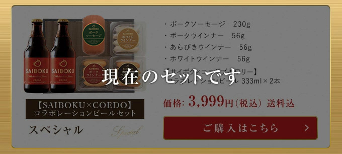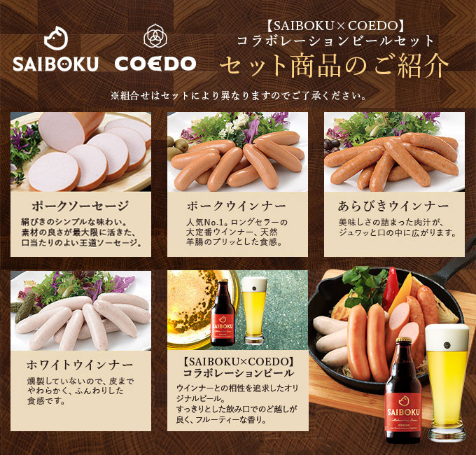 | 内 容 | ・ポークソーセージ 230g ・ポークウインナー 56g ・あらびきウインナー 56g ・ホワイトウインナー 56g ・【サイボク×コエドブルワリー】 コラボレーションビール 333ml×2本 |