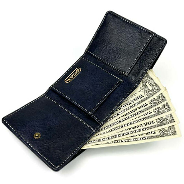 ロゴプレートがデザインされたシンプルな三つ折り財布。