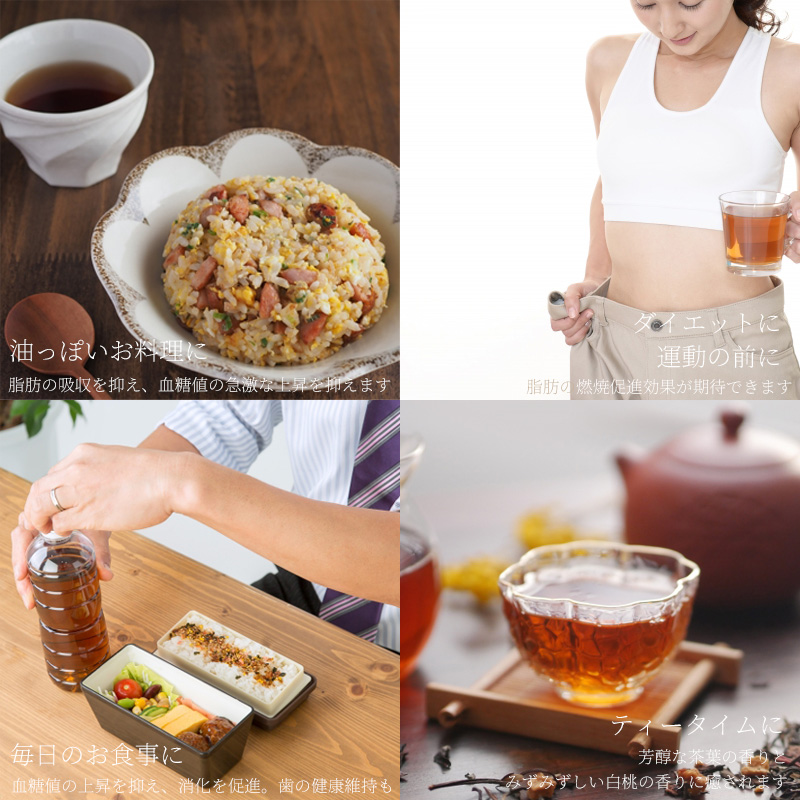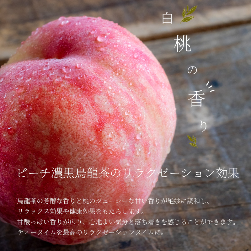 桃の香りの濃黒烏龍茶です。黒烏龍茶のポリフェノール量を最大化するため原料の品種や土、標高、発酵工程、焙煎など、あらゆる要素にこだわった烏龍茶です。その結果、140mgのポリフェノールを含有しています.ダイエット中の食事にご利用下さい。