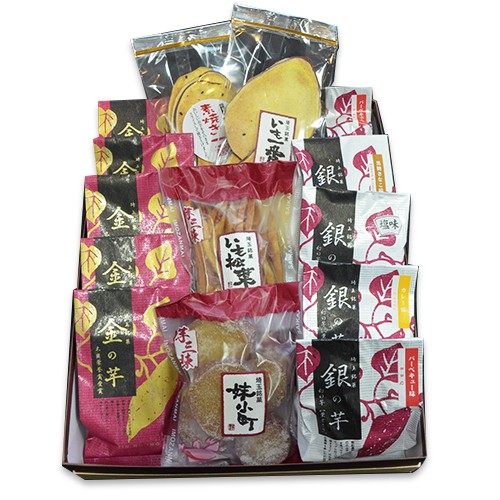 金のお芋(大臣栄誉賞受賞)5個、銀のお芋5個、妹小町・いも松葉・いも一番・素焼き一番 各1個