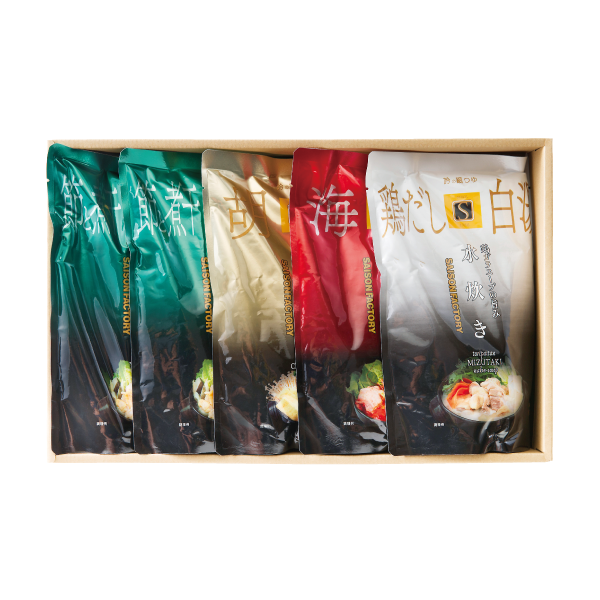 - ■セット内容:鍋つゆ(寄せ鍋×2、胡麻チャンコ鍋・海鮮チゲ・水炊き)各750g