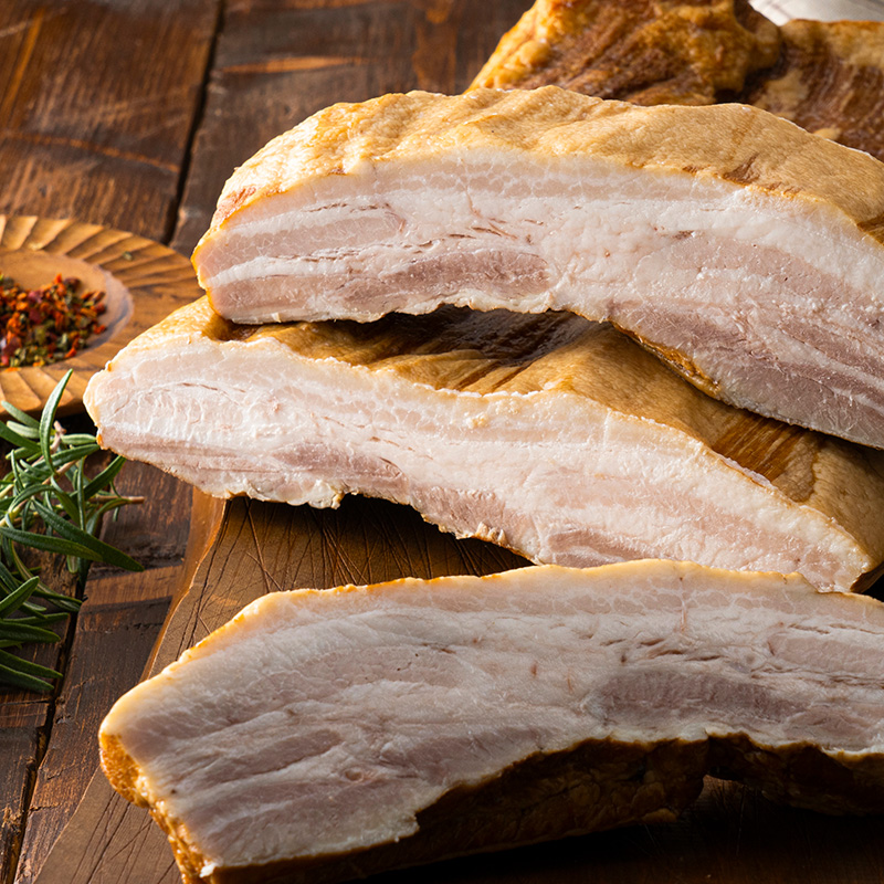 豚バラ肉を熟成スモークした人気商品、本格派ベーコンです。