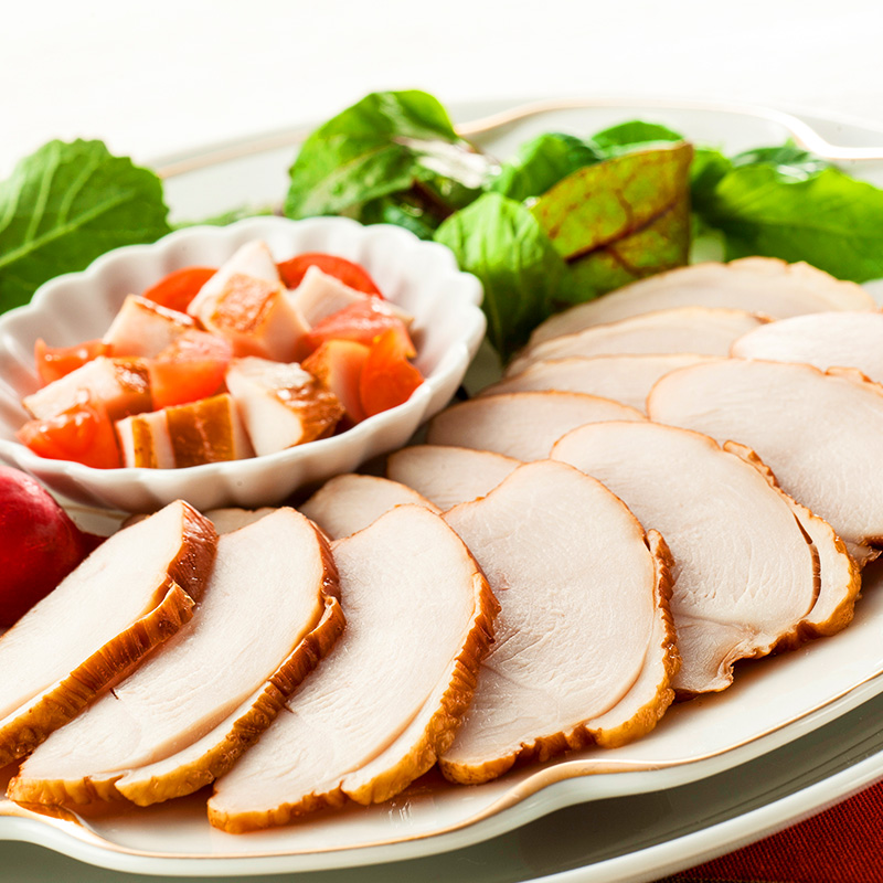 若どりムネ肉をそのまま熟成しスモークしたハムです。サラダやおつまみでお召し上がりください。