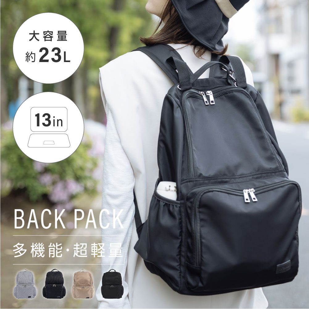 【2生地&2カラー展開】軽量なナイロンと高密度メッシュの2生地&2カラーを展開。(1)ナイロンは耐摩耗や引き裂きに強い耐久性があり、柔らかい手触り。撥水加工で雨の日も安心です。(2)高密度メッシュは超軽量で通気性抜群。背中がムレなくて夏場に最適です。中身も透けて見えません。ナイロンリュックは、保温・保冷のドリンクホルダー、メインポケットの仕切り仕様になっています。
