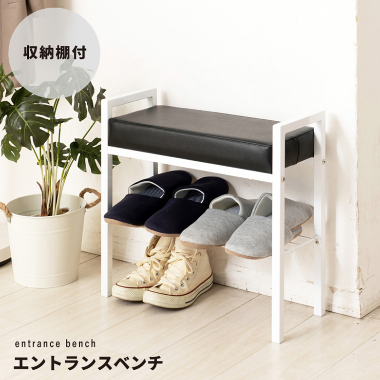●お出かけお帰りの一息に便利なコンパクトな玄関ベンチ。座面はクッション付で快適な座り心地。