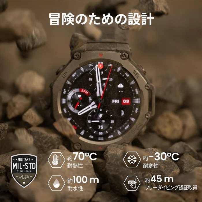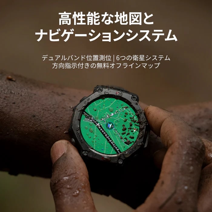 ステンレススチールボディとゴリラガラスでコーティングされたディスプレイは9つのMIL規格試験に合格し、業界最先端のGPS技術と圧倒的な高輝度AMOLEDディスプレイが融合したT-Rex3は、アウトドア用スマートウォッチとして最高のパフォーマンスを発揮します。最大27日間のバッテリー性能と最新Aiを統合した機能性も加わって、T-Rex 3はあなたの挑戦をサポートする最高の相棒になるでしょう。