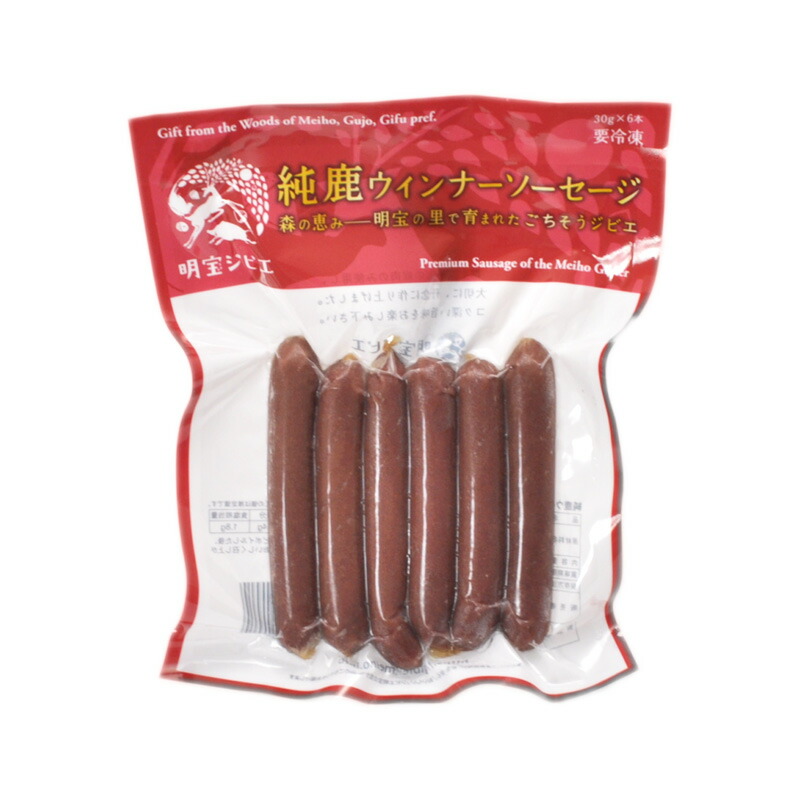 明宝ジビエ 純鹿ウインナーソーセージジビエ三大産地と言われる郡上(ぐじょう)の山々に育まれ、豊かに成長した天然鹿肉のみを使用し丹念に作り上げたウインナーソーセージです。製造は明宝ハムを作っている信頼・実績のある明宝特産物加工です。明宝ハムのハム職人が作った深い旨味と食べごたえをご堪能下さい。ご家庭はもちろんバーベキューやアウトドアクッキングで大活躍します。