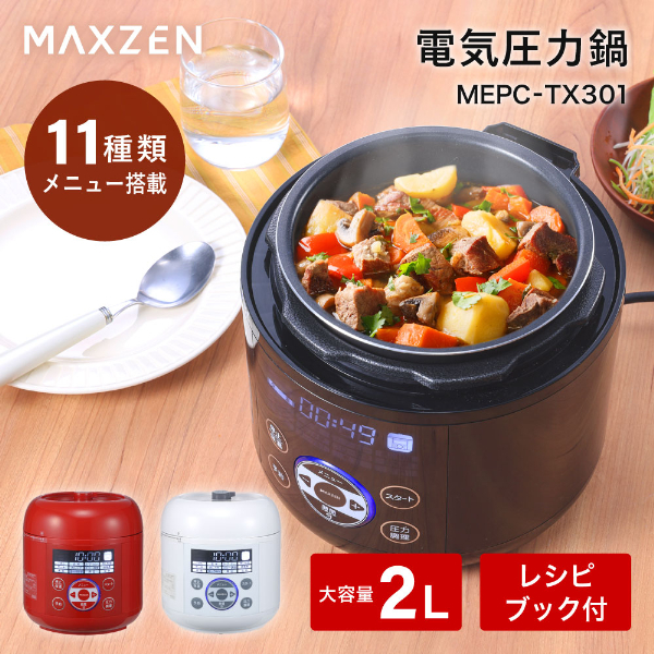 期間限定ポイント5倍! 電気圧力鍋 圧力鍋 MAXZEN 2L 炊飯器 3合 簡単 時短 保温 多機能 コンパクト シンプル 蒸し調理 ヨーグルト ケーキ MEPC-TX301-BK